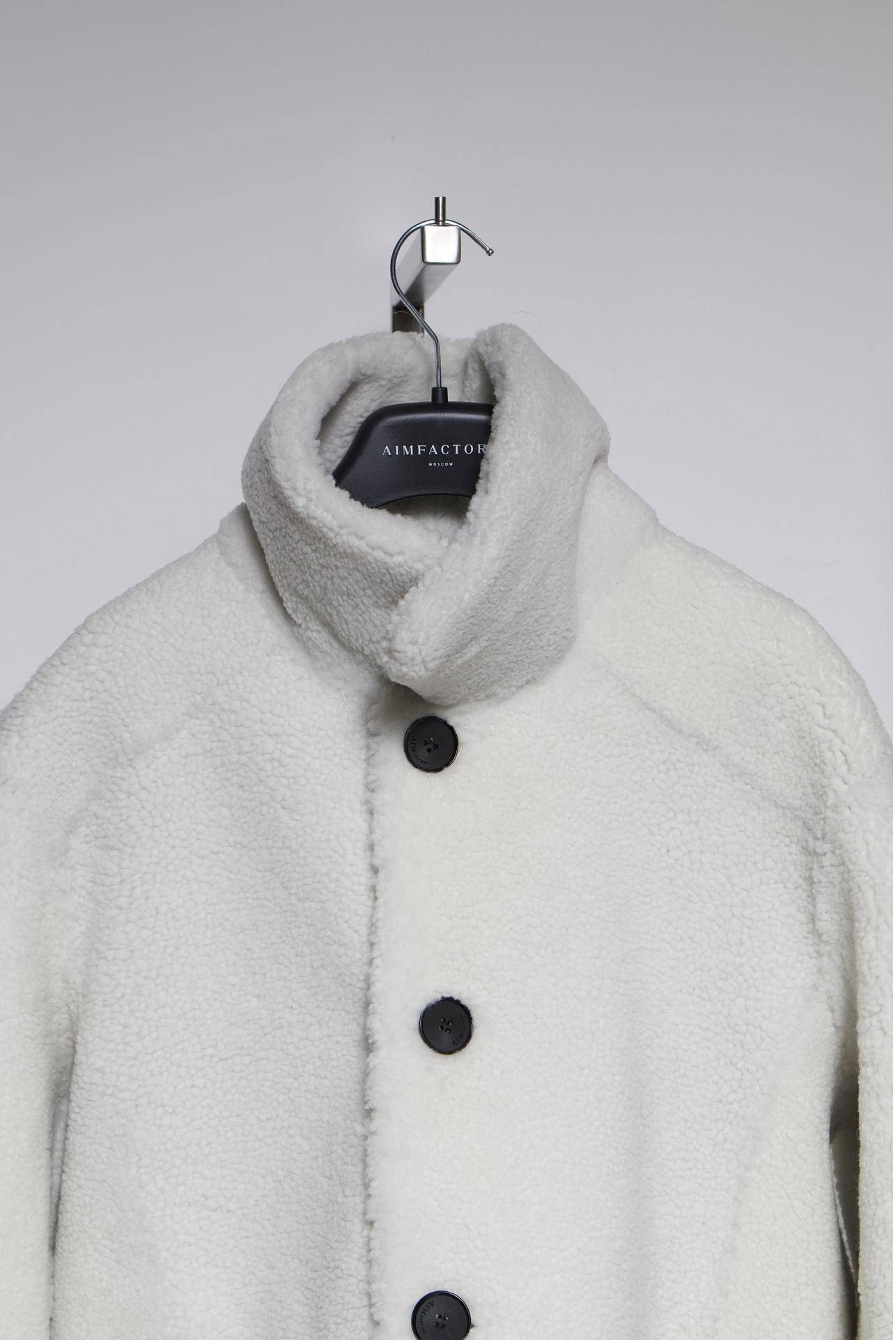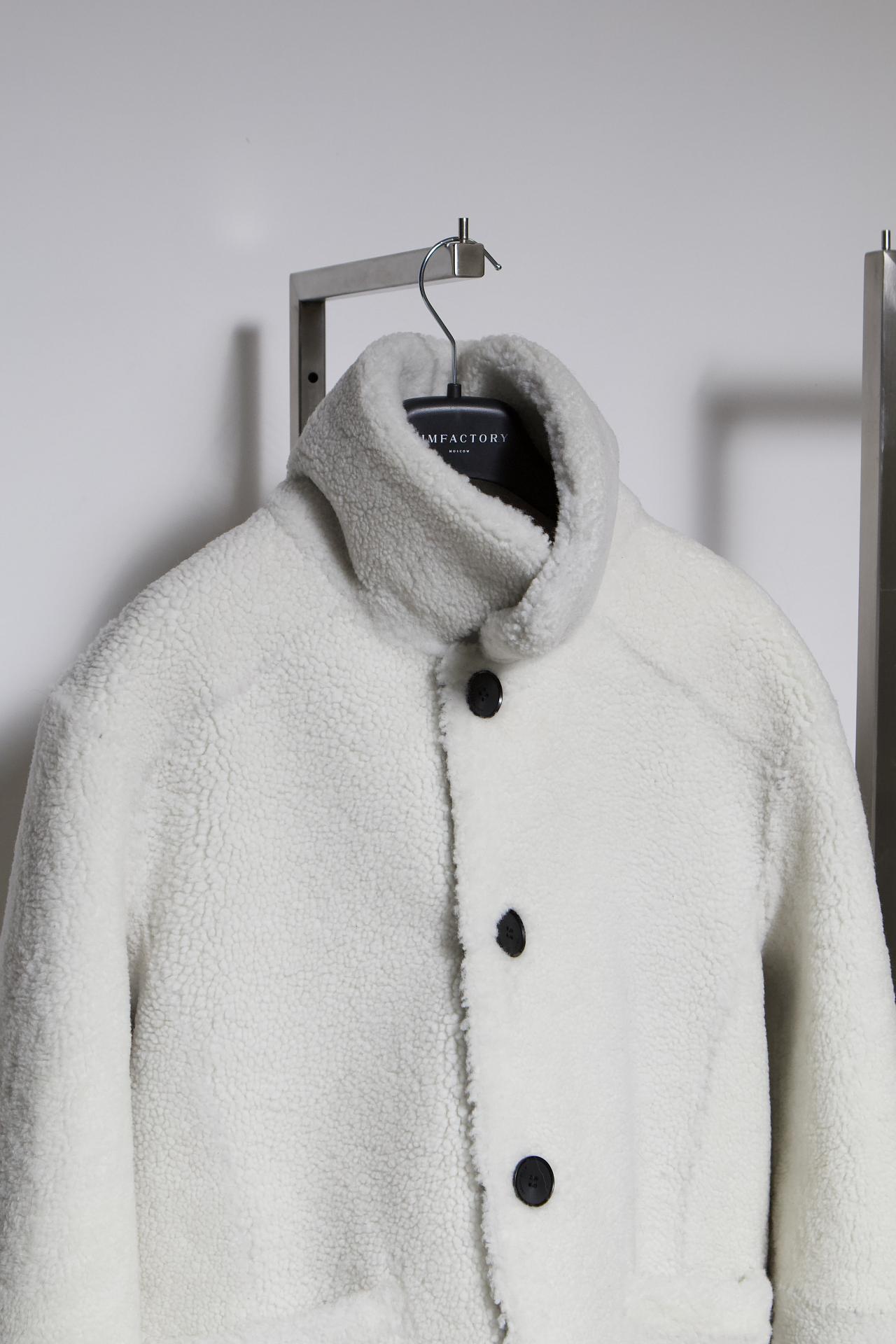 Шуба из натурального меха прямого кроя. Для пошива использовали овчину породы Меринос с коротким ворсом. Застежка на пуговицы в тон с эффектом натурального рога. Длина изделия: 70 см. Посадка свободная – onesize.