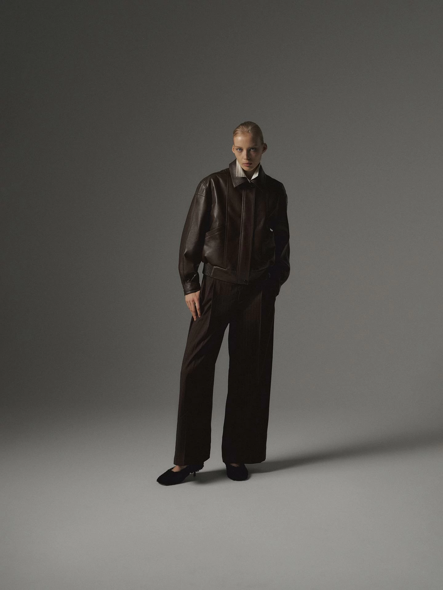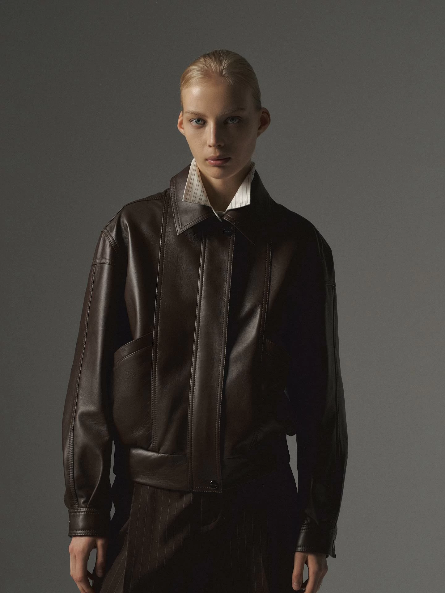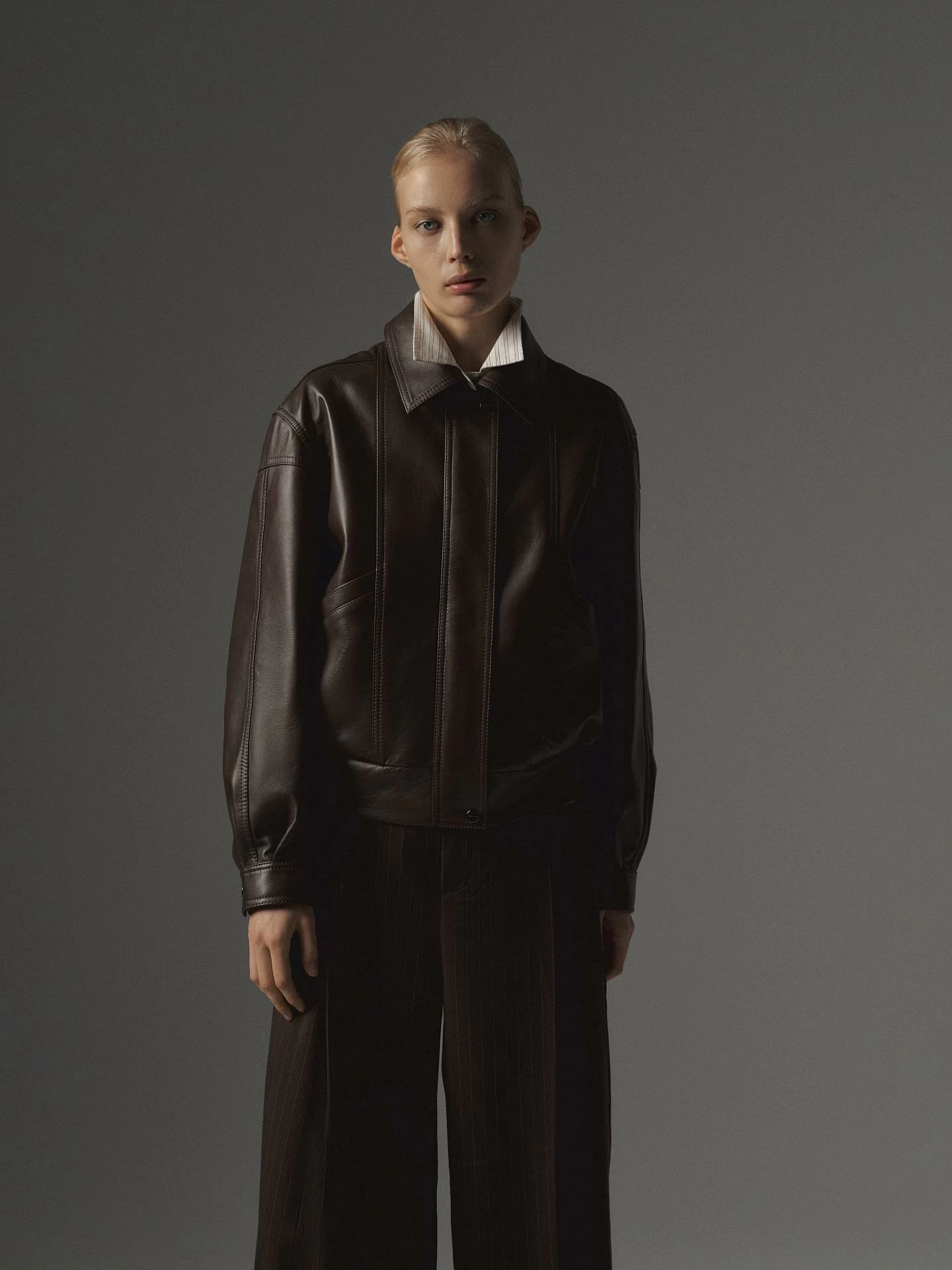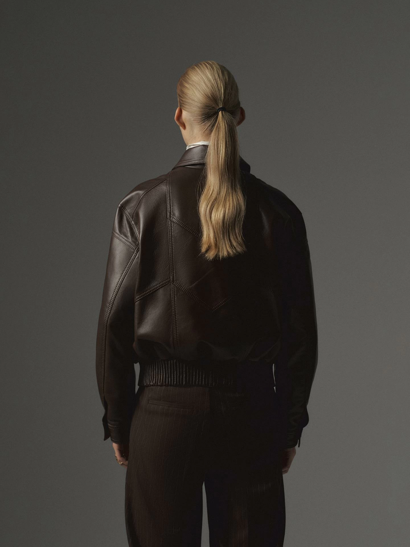 Женственная куртка бомбер из гладкой кожи наппа. Центральная молния скрыта за планкой, что позволяет сделать фокус на акцентных деталях отделки: декоративных швах в районе плеча, рукава, карманов, спинки. Мягкий отложной воротник. Пояс с плотной плиссированной вставкой и рукава на манжетах добавляют комфорта и изящества. Свободная посадка oversize. Длина изделия: 60 см.