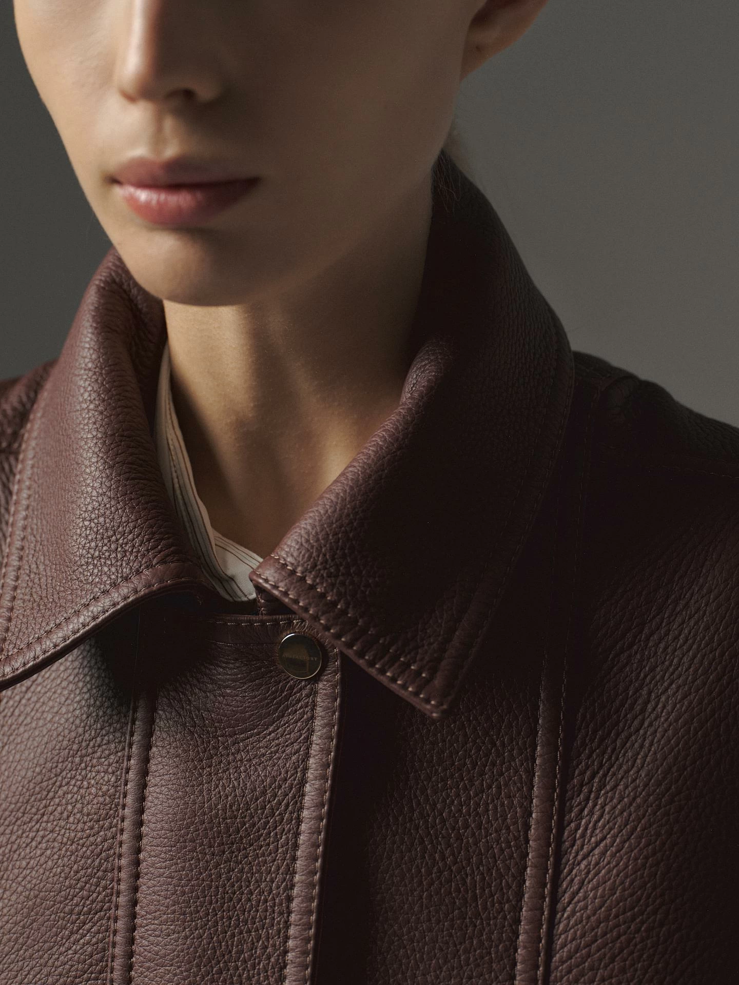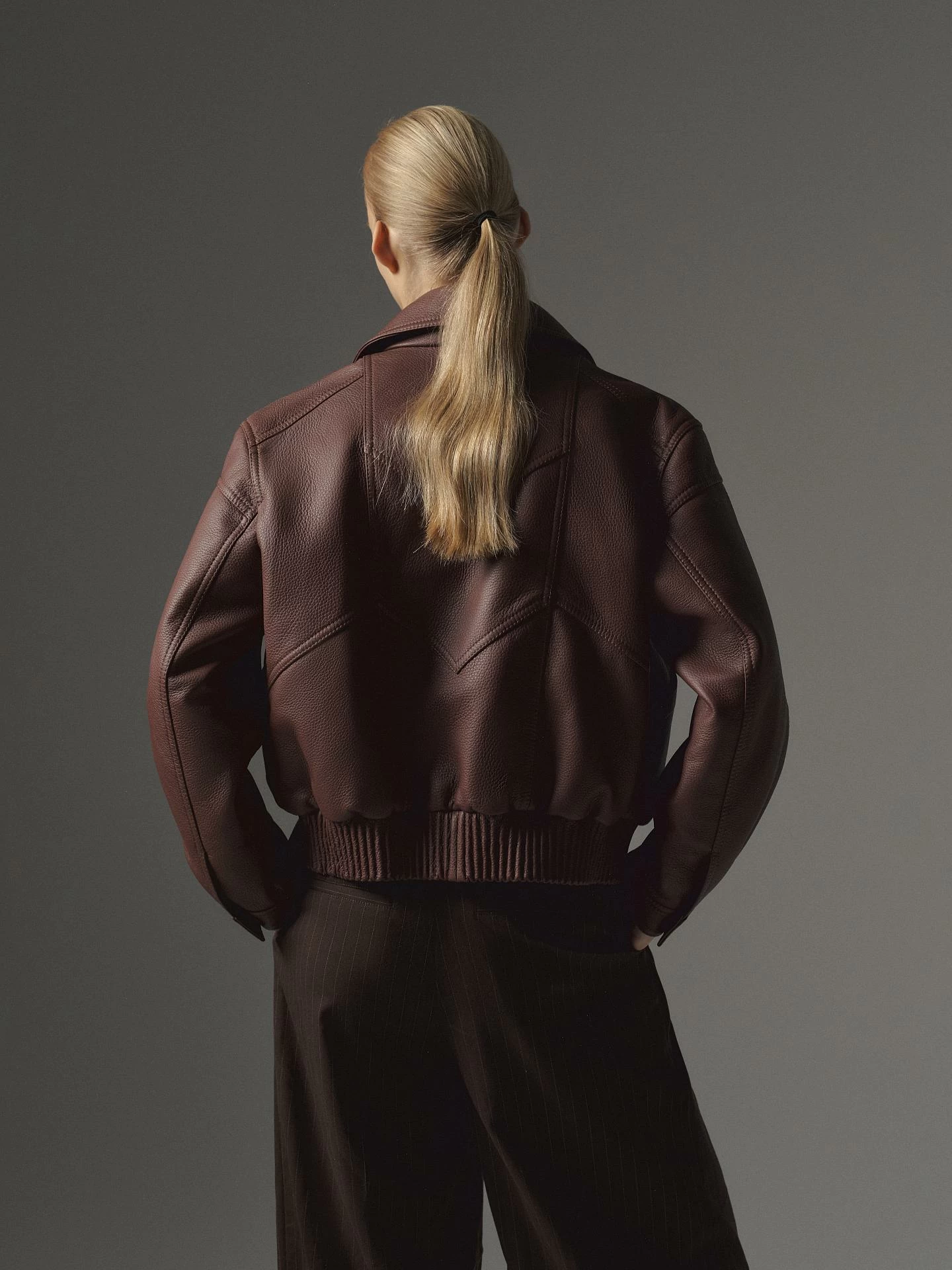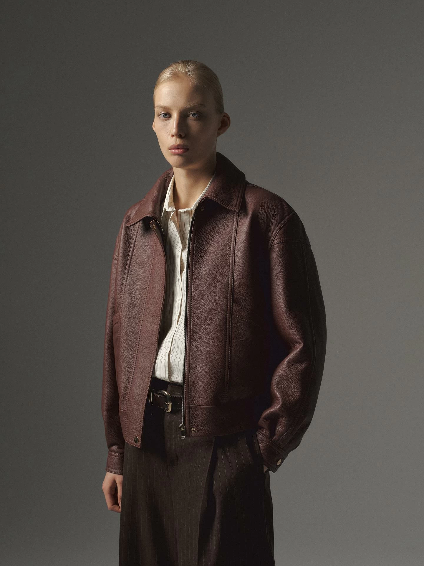 Женская куртка бомбер из итальянской фактурной кожи оленя. Сегмент премиум класса. Центральная молния, скрытая за планкой, отложной воротник, пояс с плотной плиссированной вставкой, рукава на манжетах. Отделка рукавов, плеч, спинки, карманов декоративными акцентными швами. Свободная посадка oversize. Длина изделия 58 см.