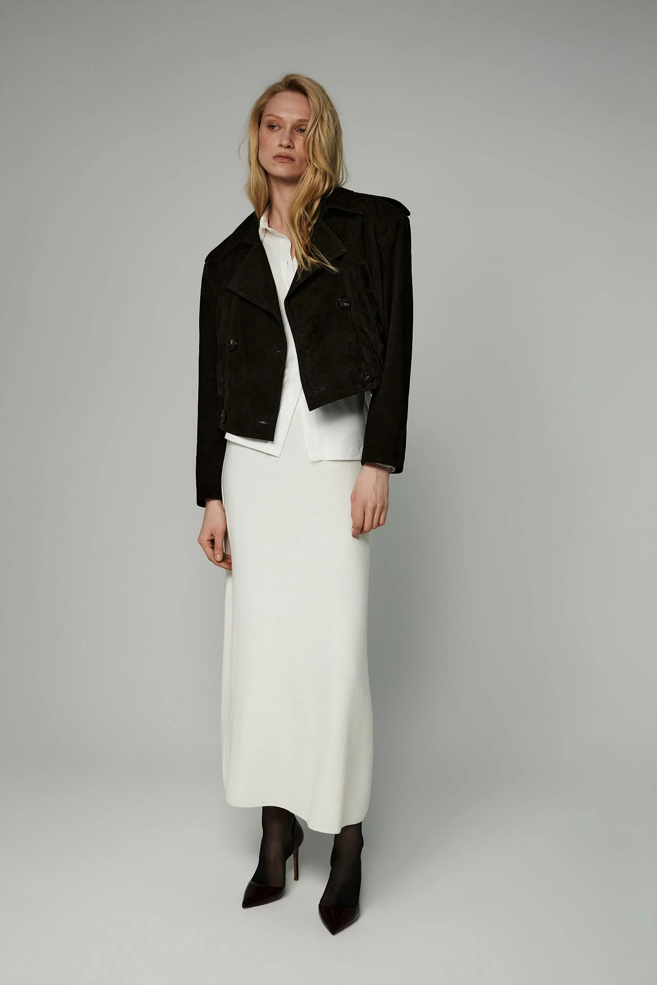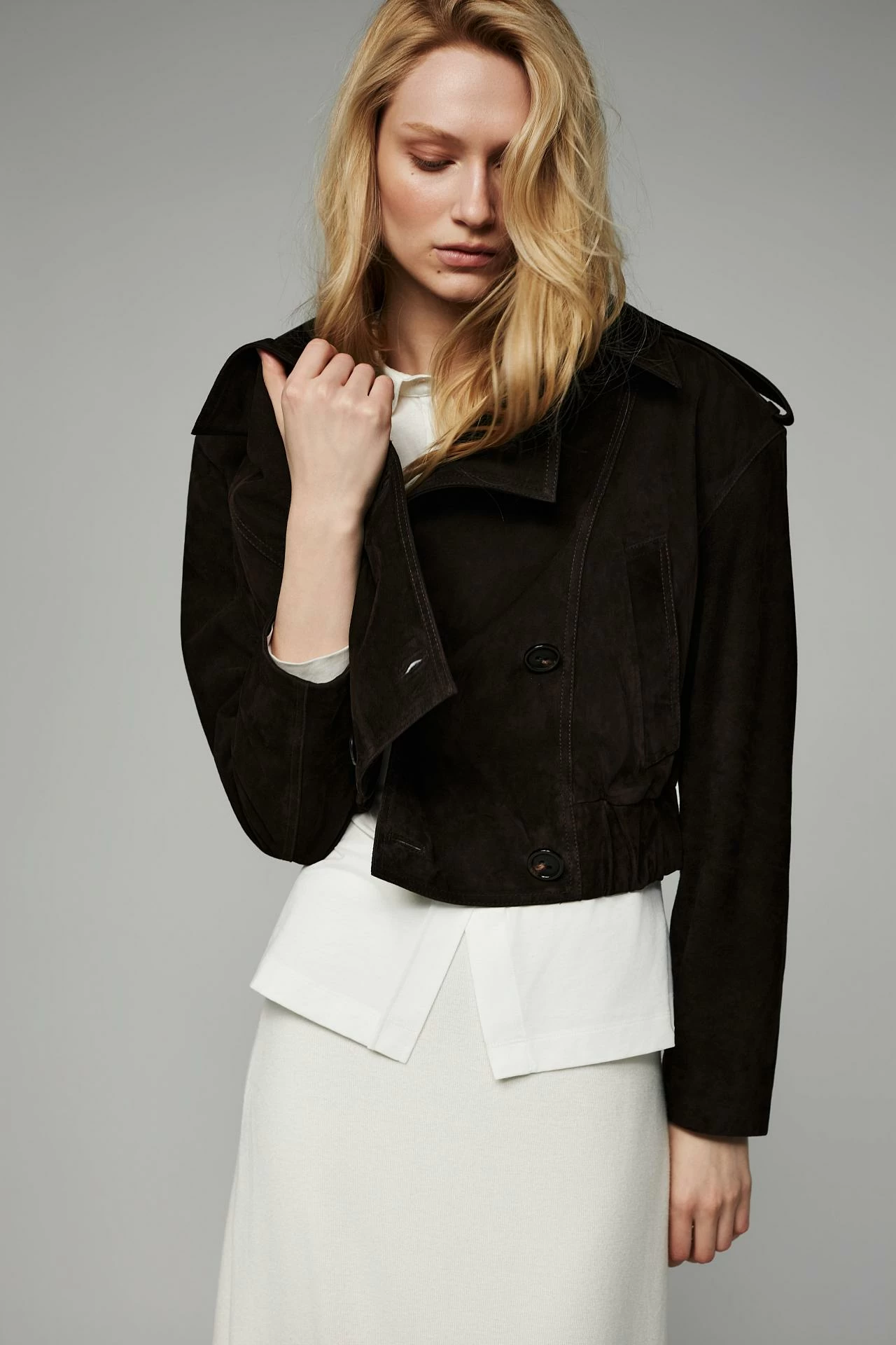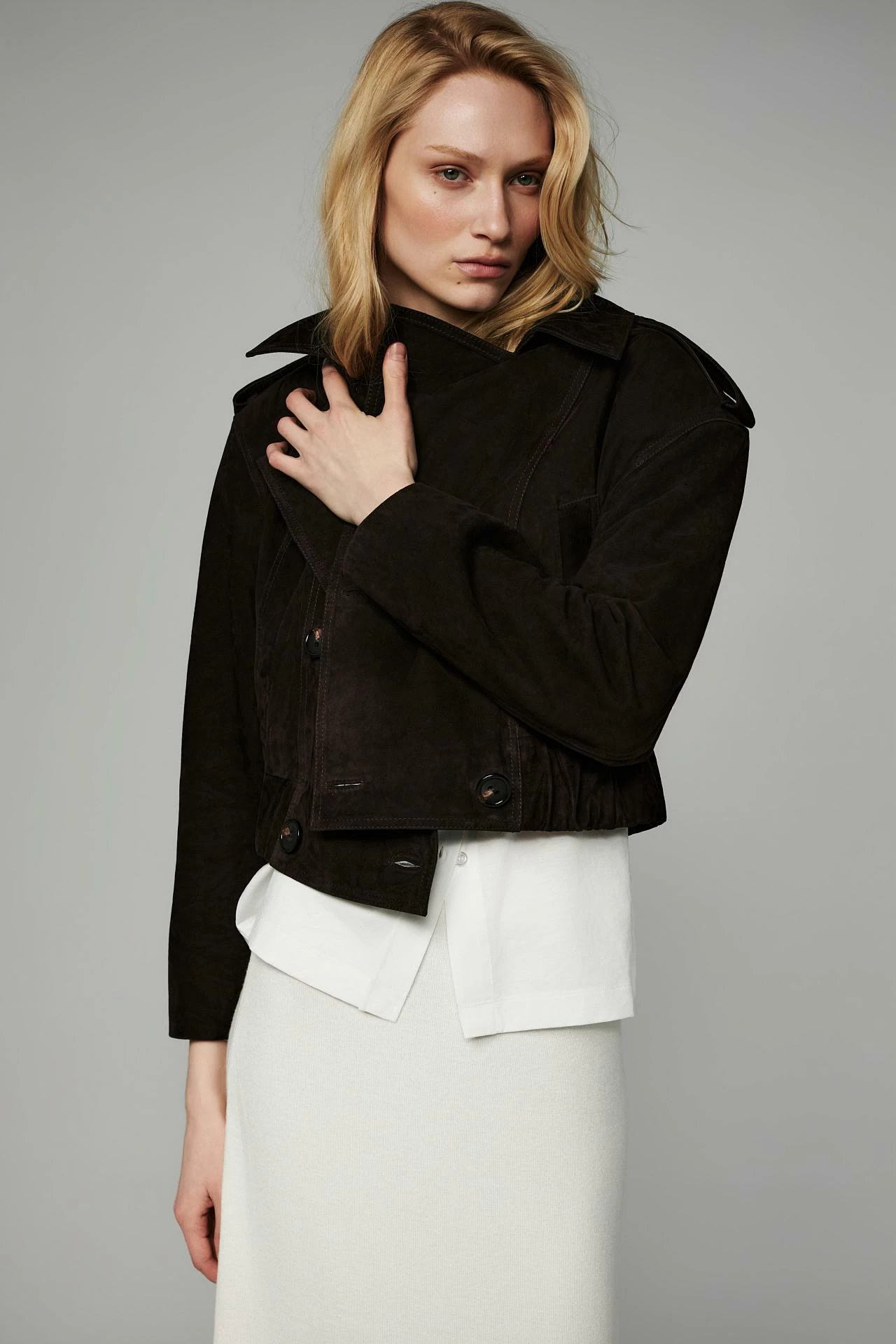 Женская укороченная куртка с широкими лацканами, выполнена из мягкой натуральной замши и вдохновлена классическим тренчем. Модель дополнена двубортной застёжкой, акцентными плечами, погонами и прорезными карманами. Резинка на талии и лёгкая сборка по низу формируют силуэт и добавляют объём. Длина изделия: 48 см.