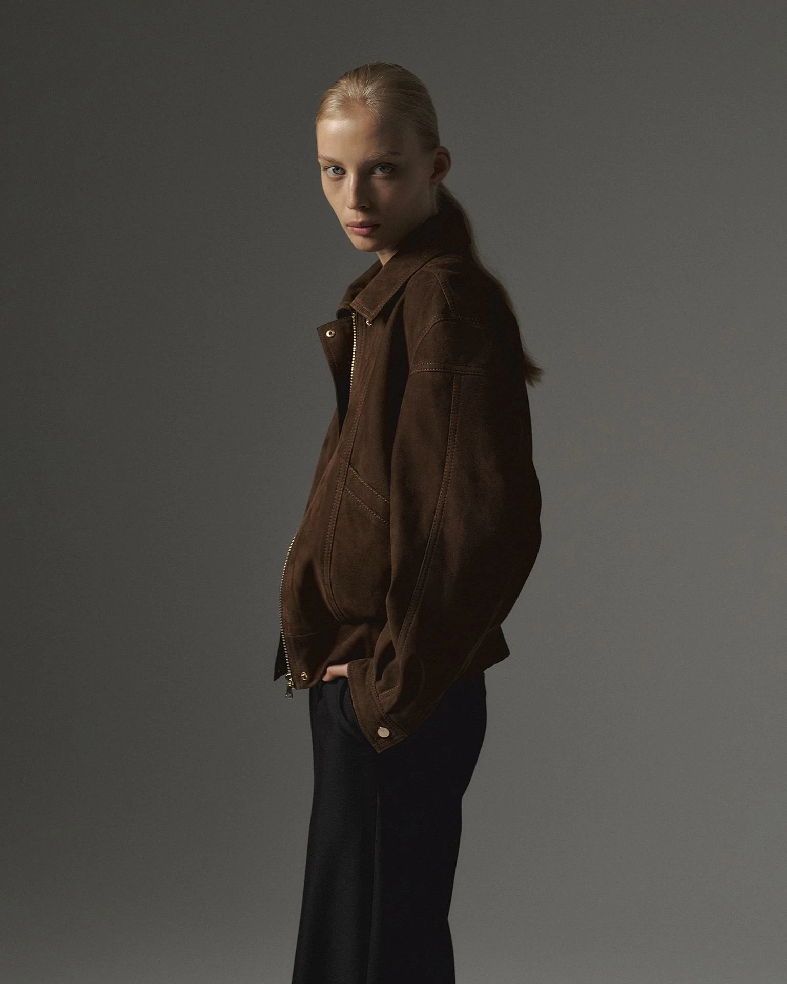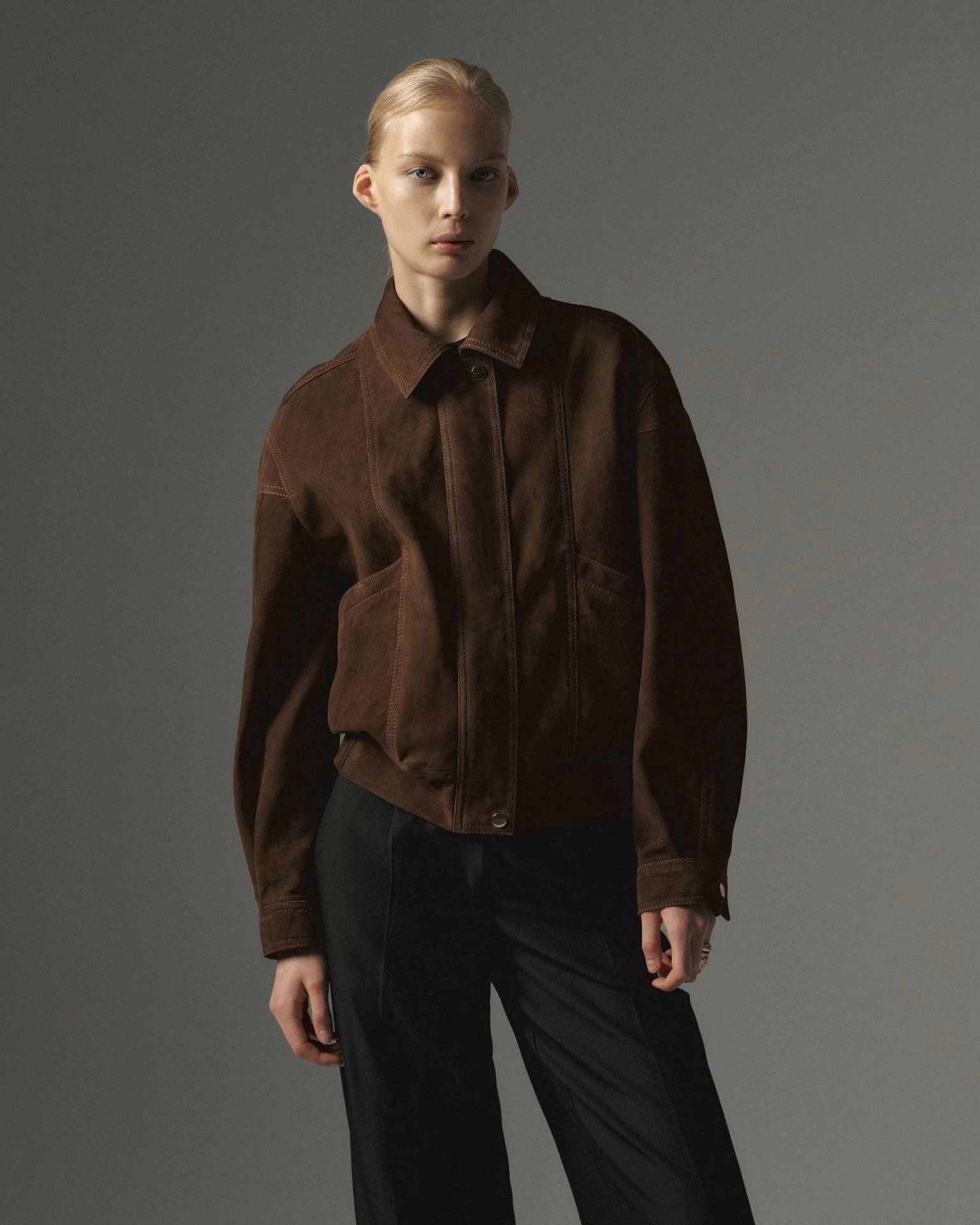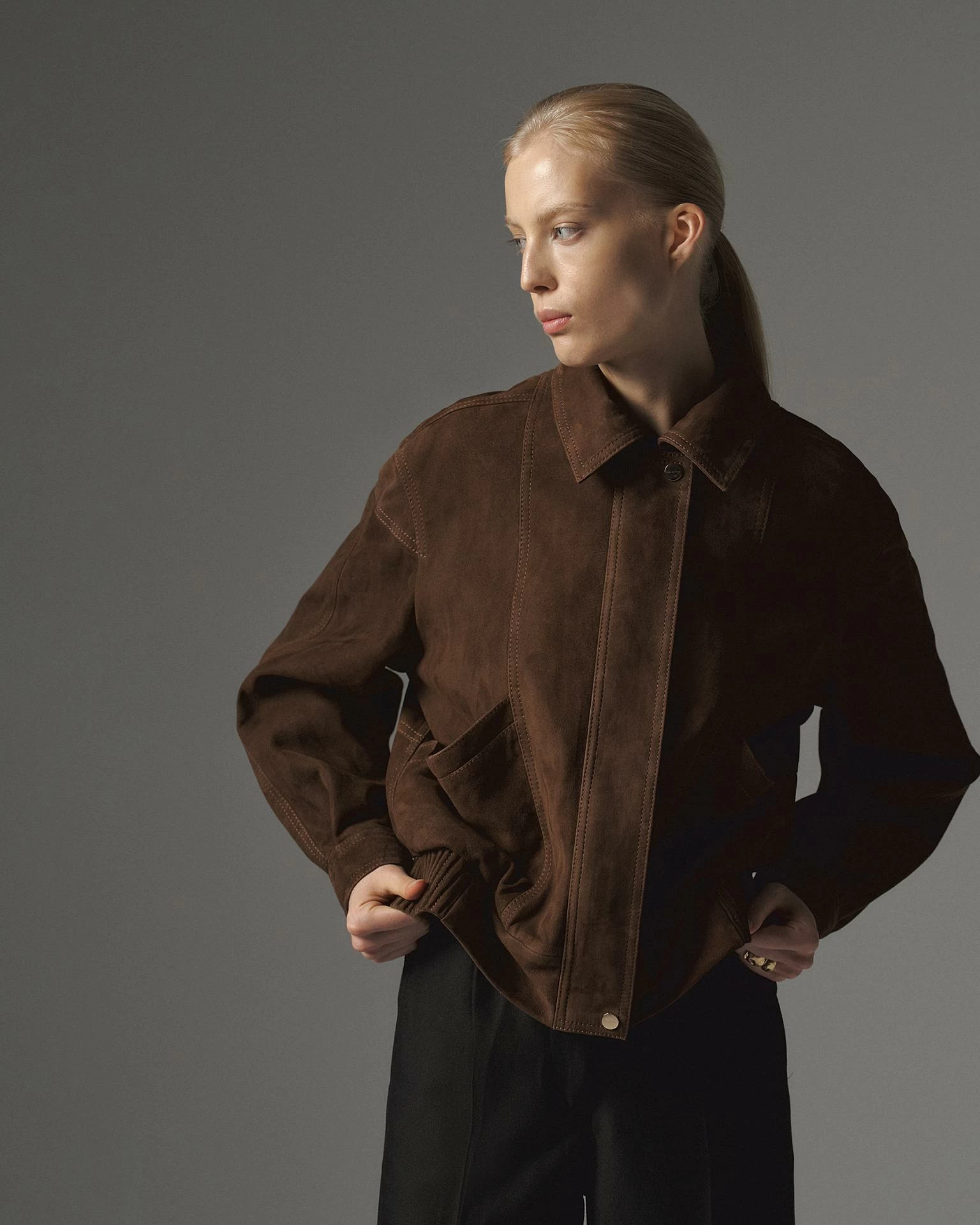 Женственная куртка бомбер из замшевой кожи наппа. Центральная молния скрыта за планкой, что позволяет сделать фокус на акцентных деталях отделки: декоративных швах в районе плеча, рукава, карманов, спинки. Мягкий отложной воротник. Пояс с плотной плиссированной вставкой и рукава на манжетах добавляют комфорта и изящества. Свободная посадка oversize. Длина изделия: 60 см.