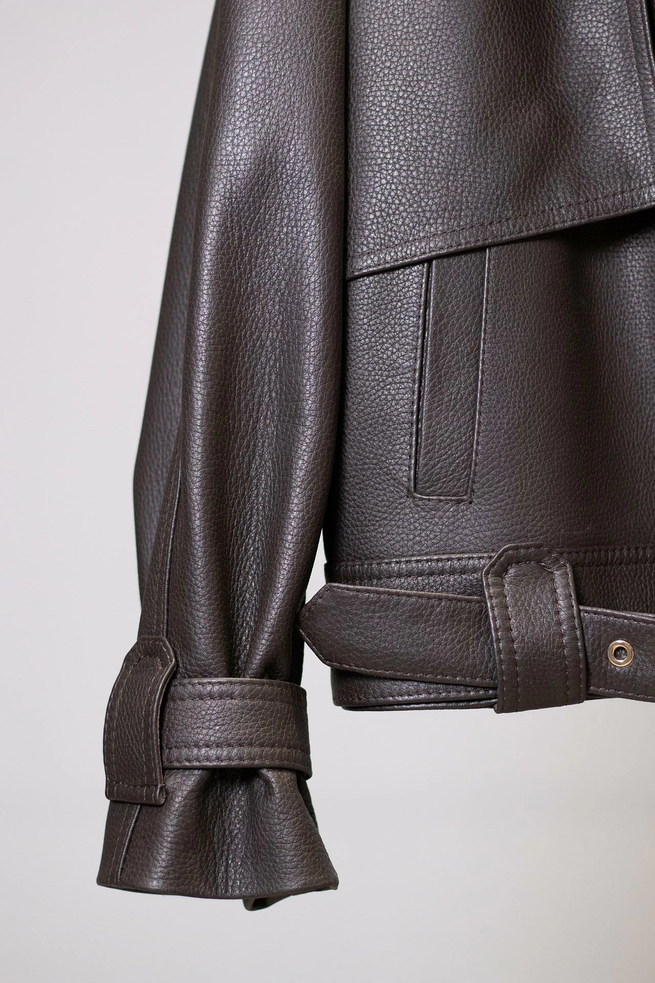 Женская объемная куртка с широкими лацканами, выполнена из фактурной итальянской кожи оленя и вдохновлена классическим тренчем. От него изделию досталась отлетная кокетка как обязательная деталь тренчкота. Рукав реглан даёт больше свободы движения; паты на рукавах; два прорезных кармана; застёжка на молнию; регулируемый пояс с металлической пряжкой. Длина изделия: 60 см. Посадка: свободная/оверсайз.