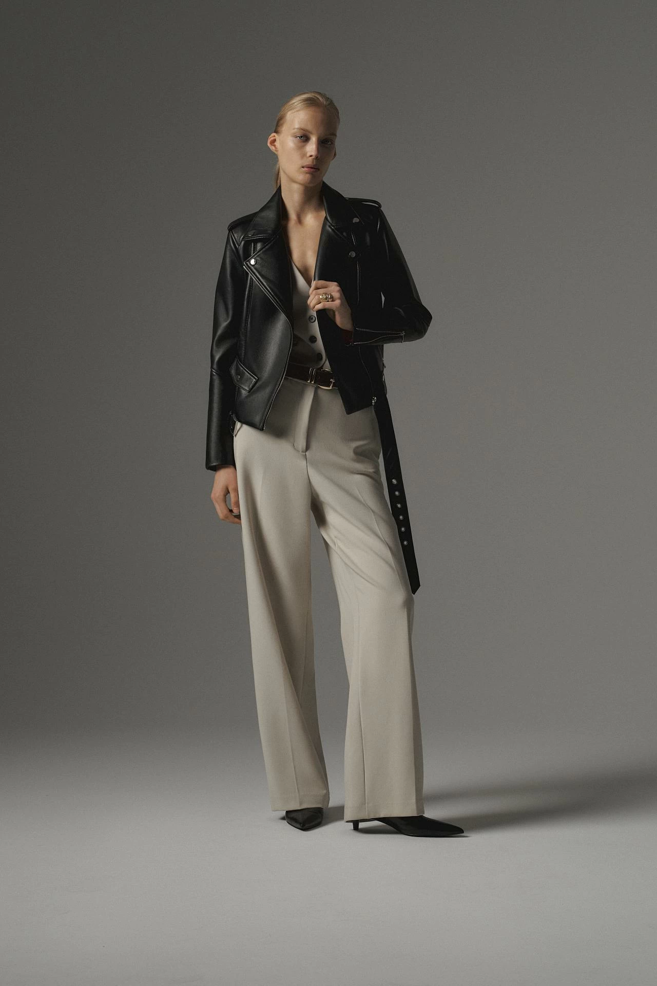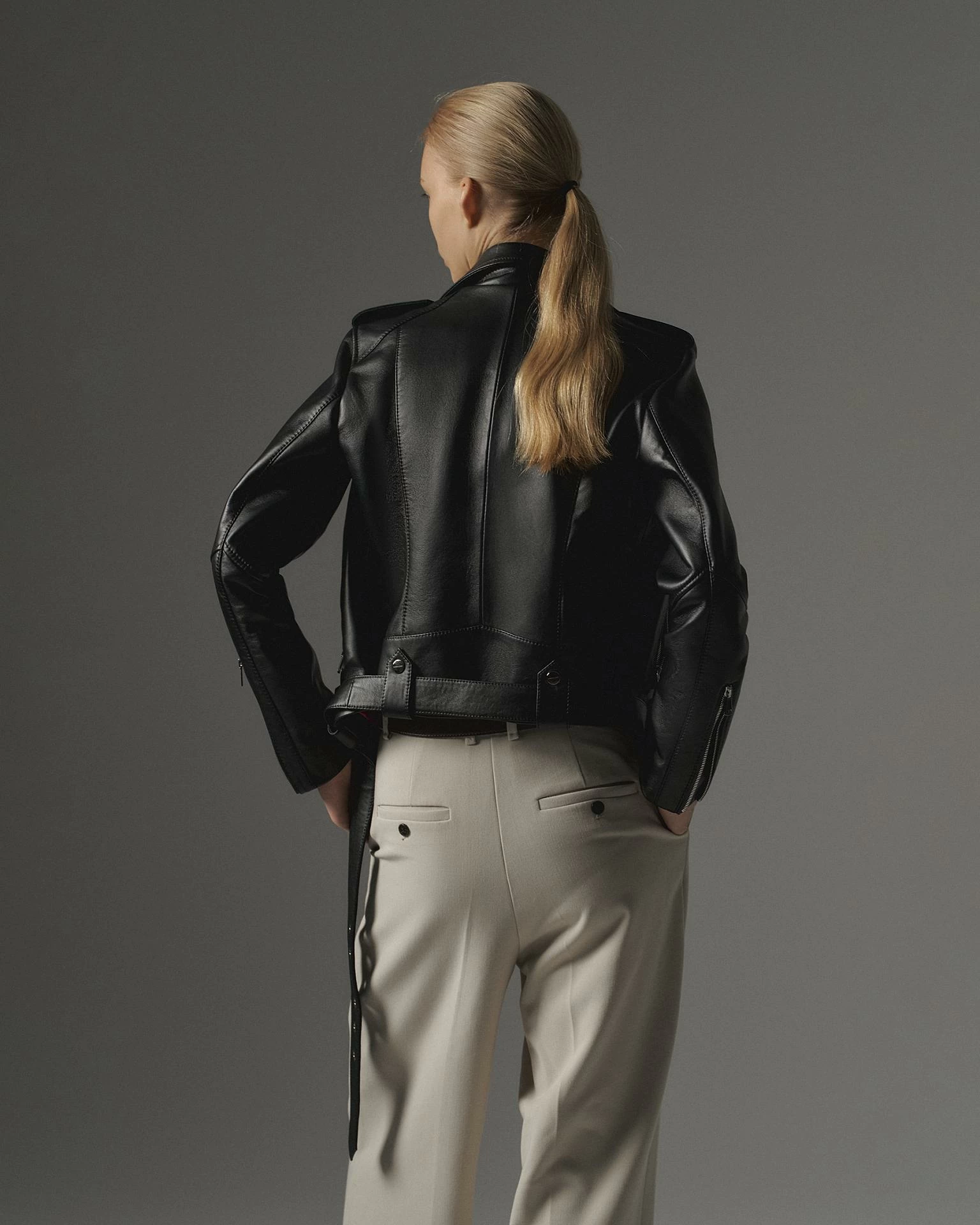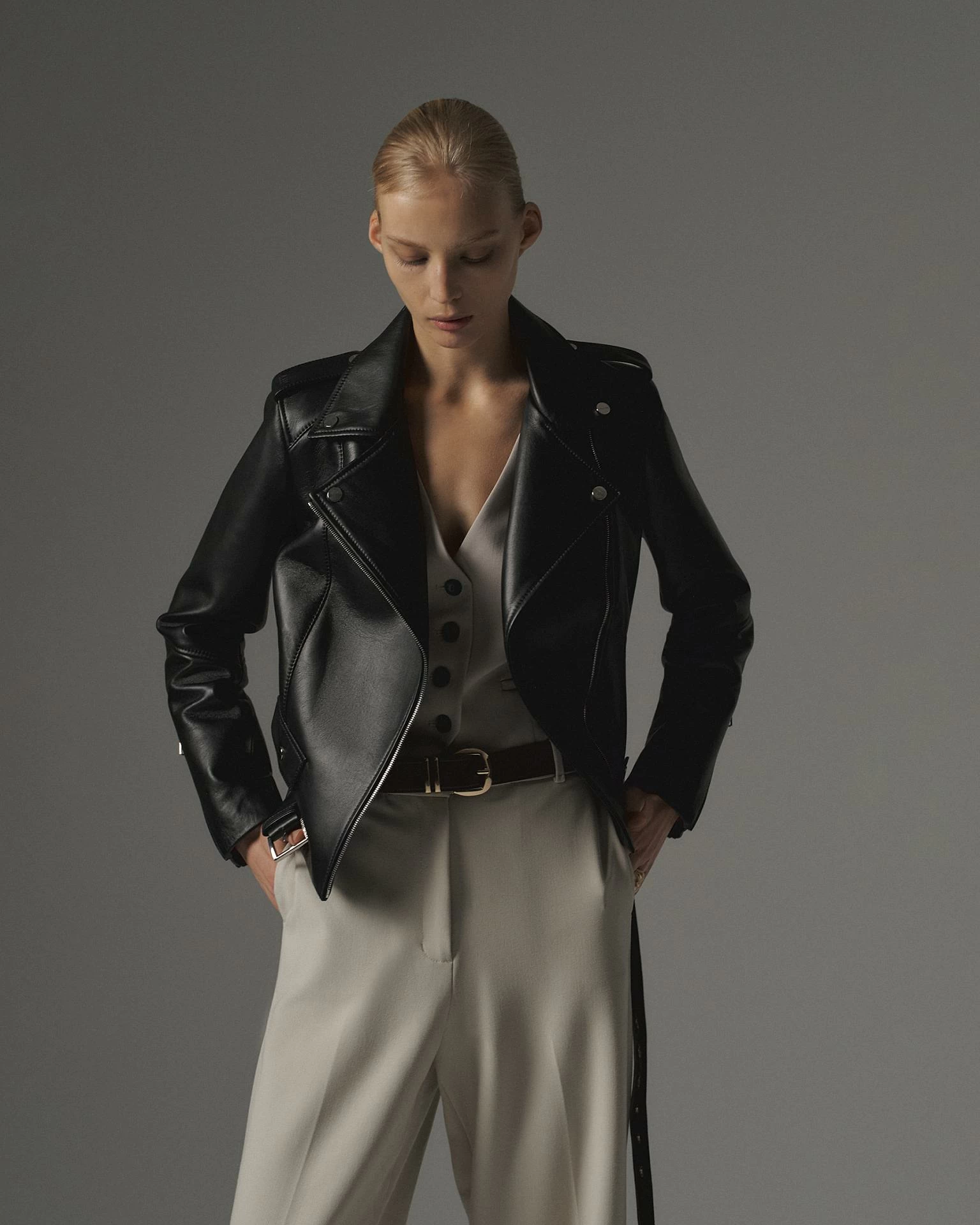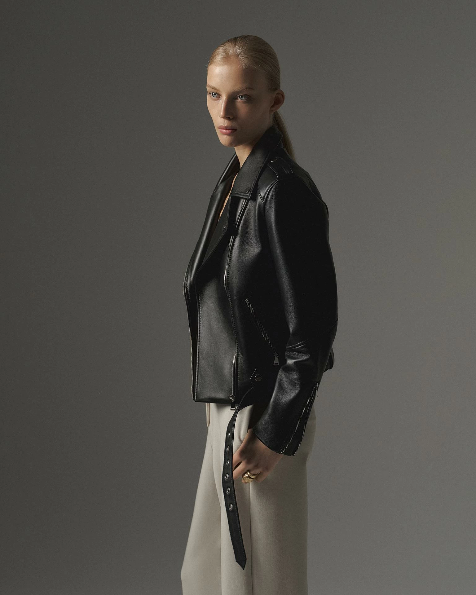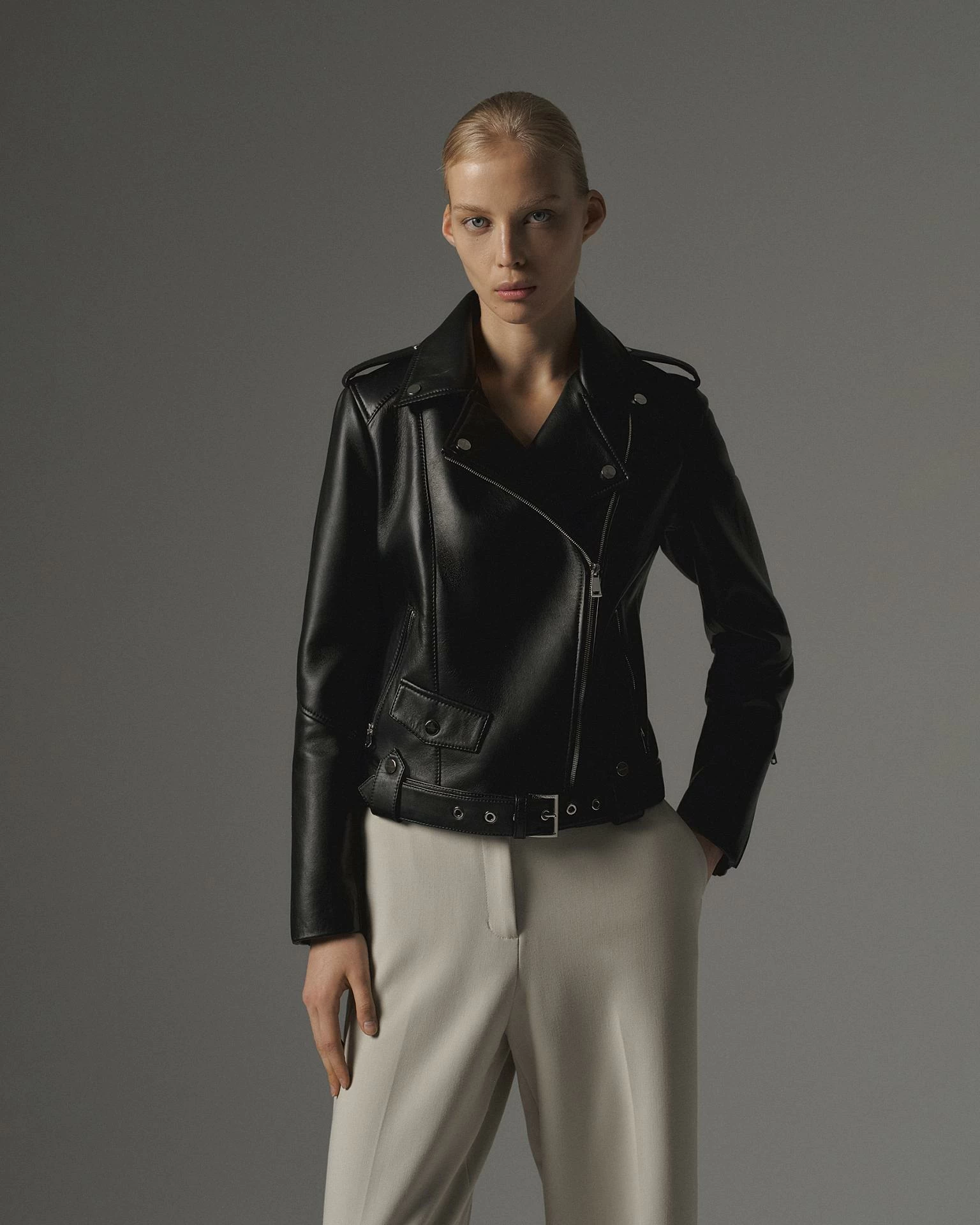 Классическая женская байкерская куртка из гладкой итальянской кожи наппа. Асимметричная застежка-молния. Пояс с пряжкой. Манжеты рукавов с застежками-молниями. Длина изделия: 52 см. Посадка: классическая.