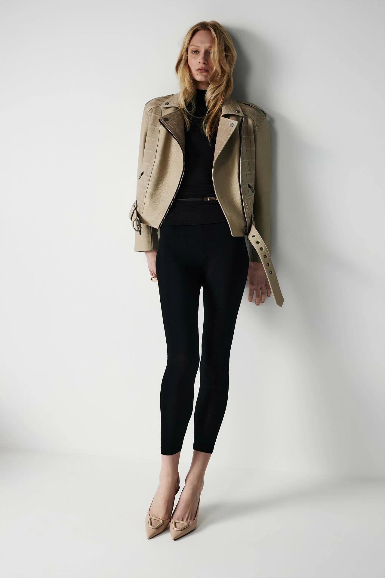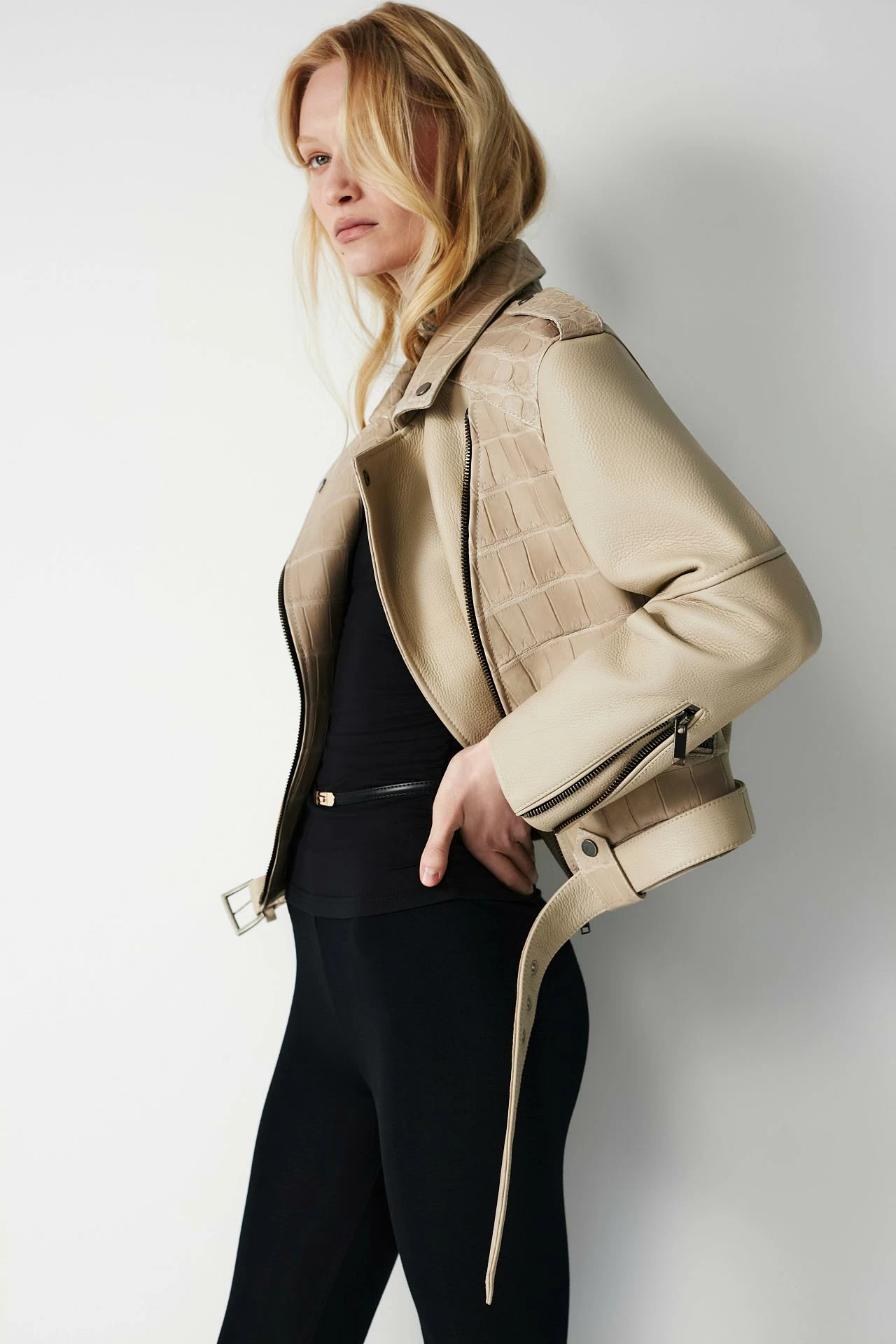 Женская байкерская куртка-косуха в комбинированном исполнении из двух видов кожи. Модель выполнена из фактурной кожи оленя премиум-сегмента и кожи крокодила. Крокодил поросус — одна из самых дорогих и ценных пород с характерным рисунком из мелких ячеек. Используется кожа одежной выделки от итальянской фабрики White Line, входящей в тройку лучших производителей в мире и поставляющей кожу для ведущих домов моды, отличающаяся мягкостью и пластичностью. Сочетание гладкой кожи крокодила и фактурной кожи оленя создает выразительный контраст текстур и подчеркивает уникальность изделия. Модель с характерными деталями: асимметричная застежка-молния, пояс с пряжкой и продуманные швы. Свободная посадка oversize формирует современный силуэт. Длина изделия — 54 см.