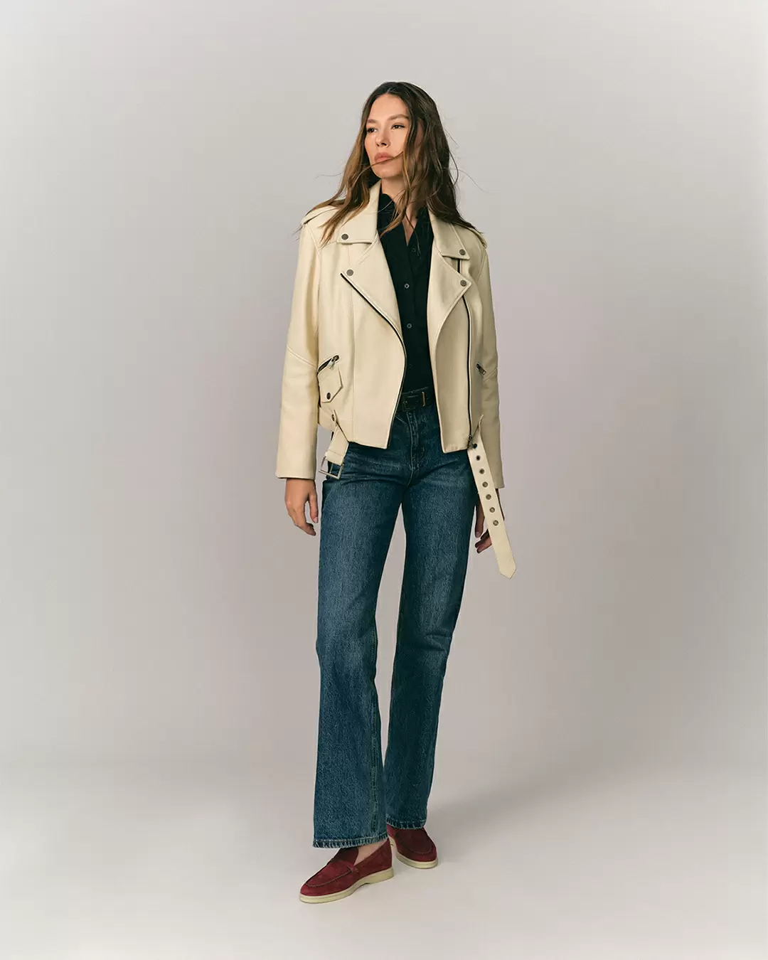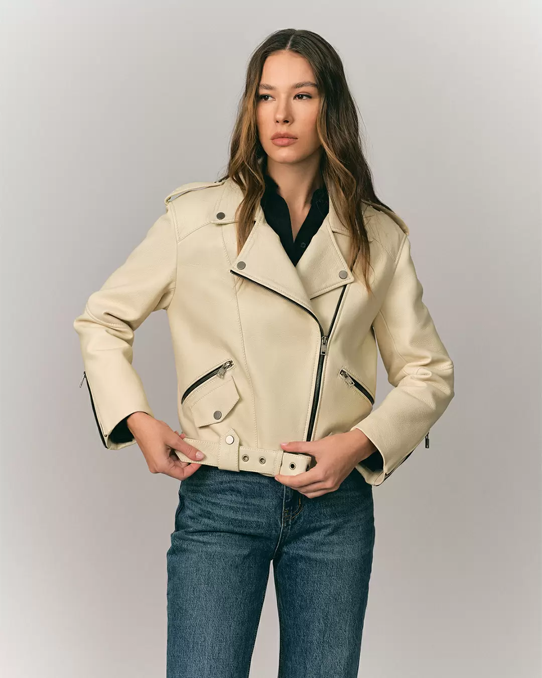Женская байкерская куртка-косуха из итальянской фактурной кожи оленя премиум-сегмента. Асимметричная застежка-молния. Пояс с пряжкой. Длина изделия: 52 см. Посадка: Оверсайз/ свободная.