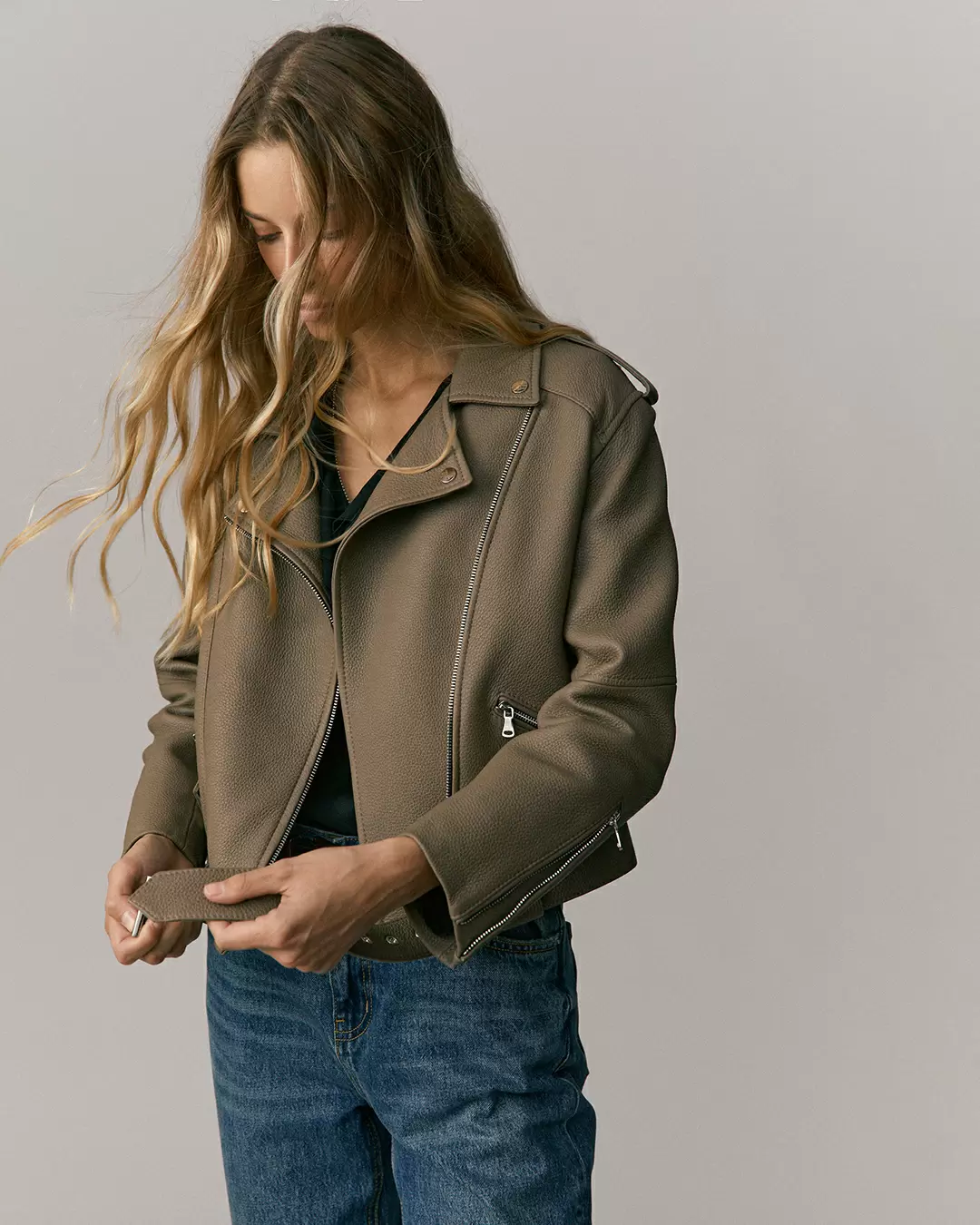 Женская байкерская куртка-косуха из итальянской фактурной кожи оленя премиум-сегмента. Асимметричная застежка-молния. Пояс с пряжкой. Длина изделия: 52 см. Посадка: Оверсайз/ свободная.