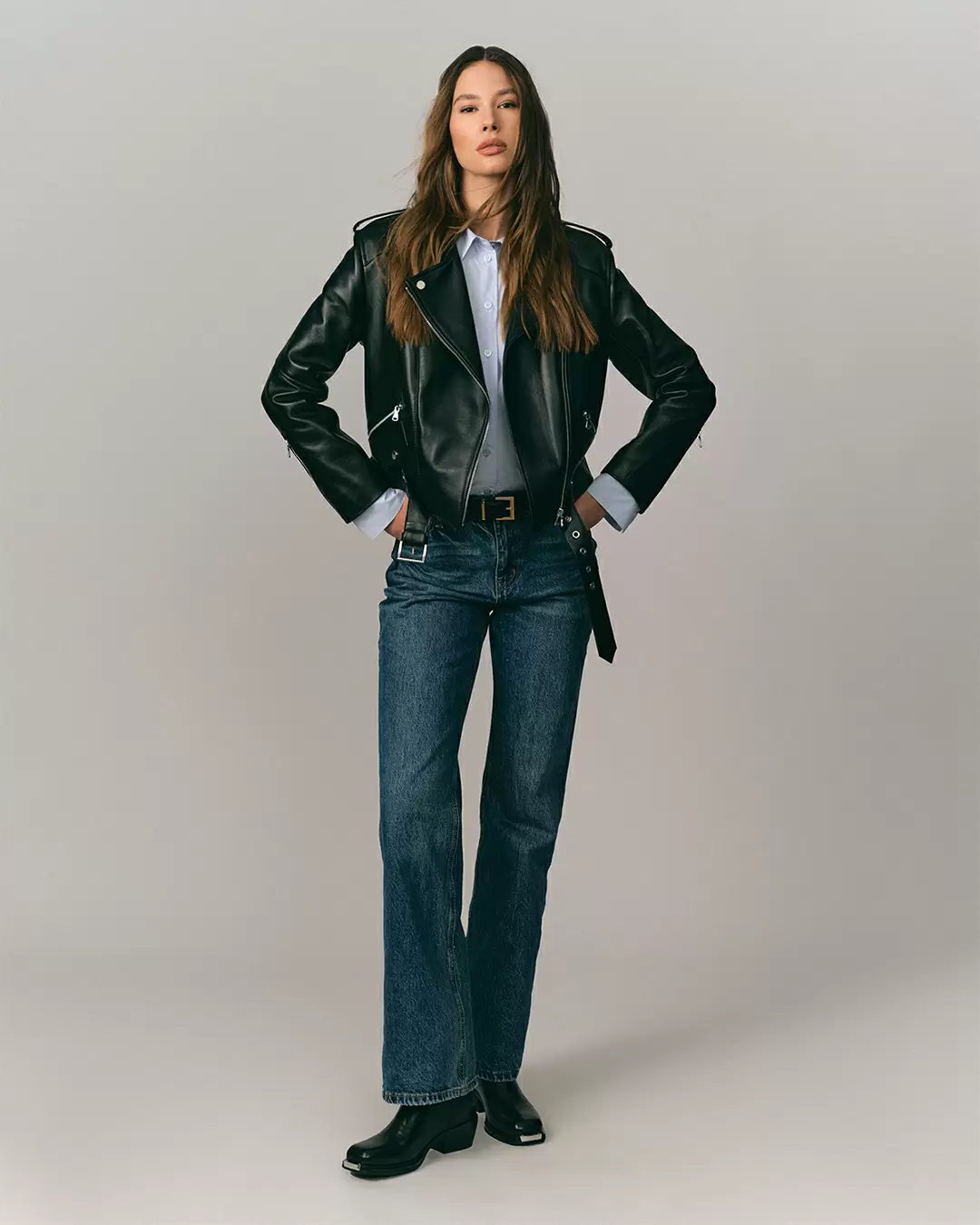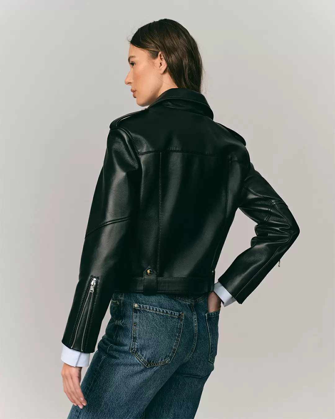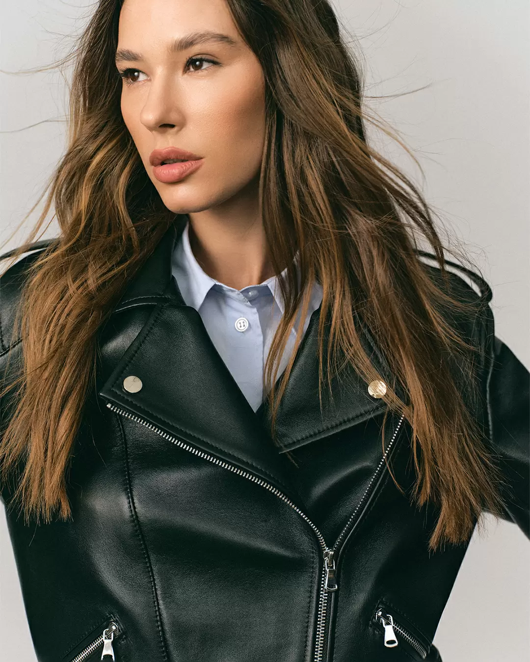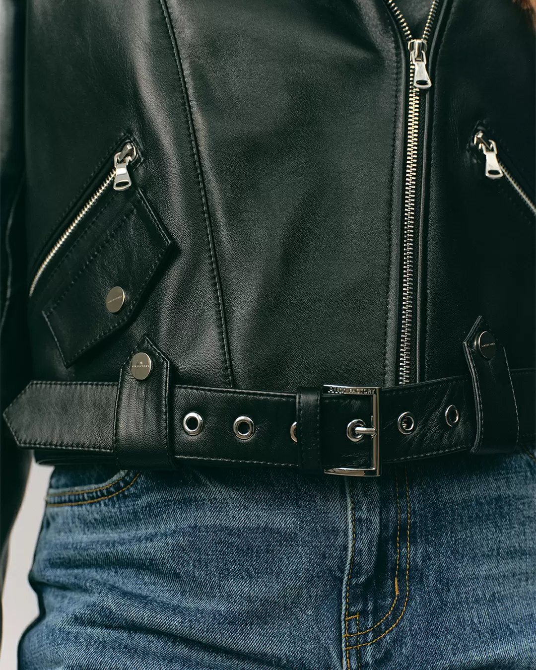 Женская байкерская куртка-косуха из итальянской кожи наппа. Асимметричная застежка-молния. Пояс с пряжкой. Длина изделия: 52 см. Посадка: Оверсайз/ свободная.