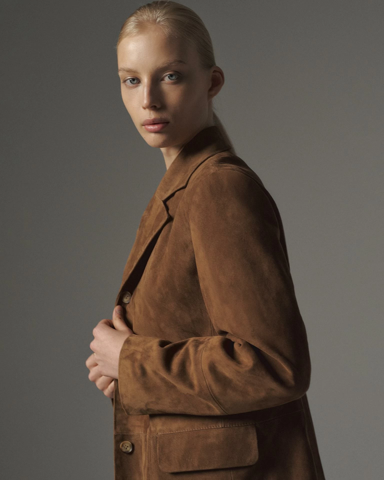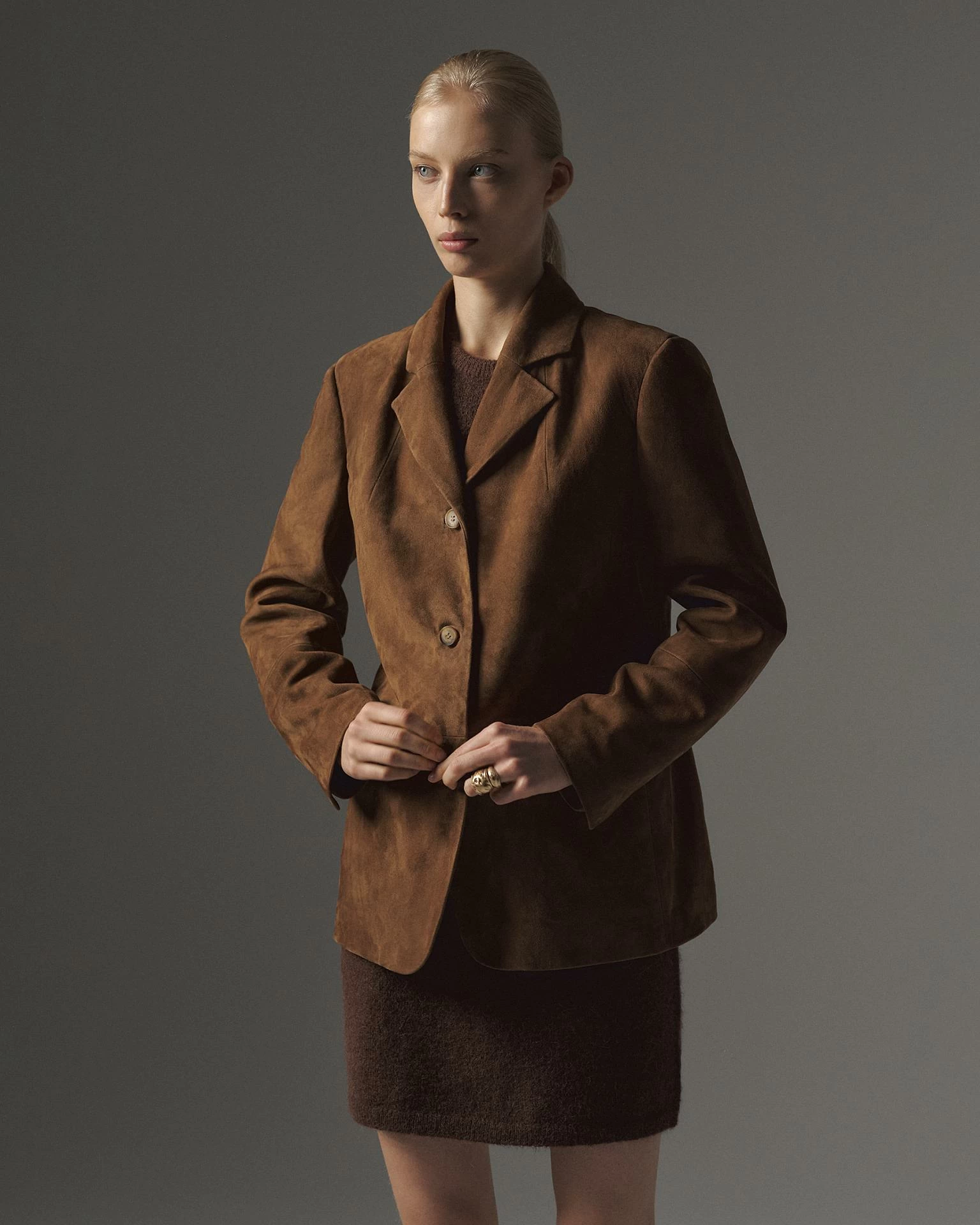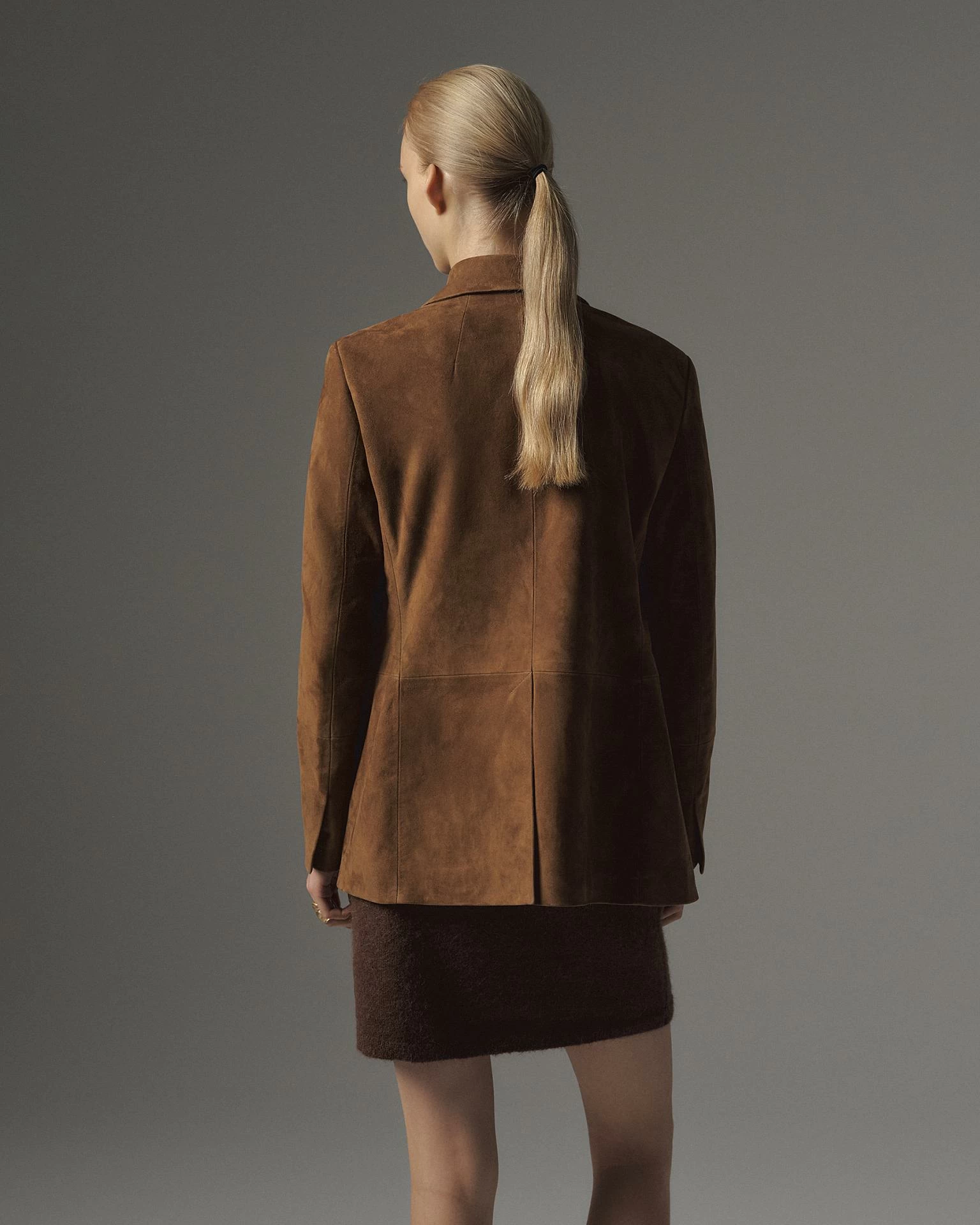 Жакет из натуральной замши. Лаконичный крой со слегка приталенным силуэтом дополнен классическим воротником, застёжкой на пуговицы и карманами с клапанами. Универсальная модель, которая легко интегрируется как в повседневные, так и в вечерние образы. Длина изделия 71 см.