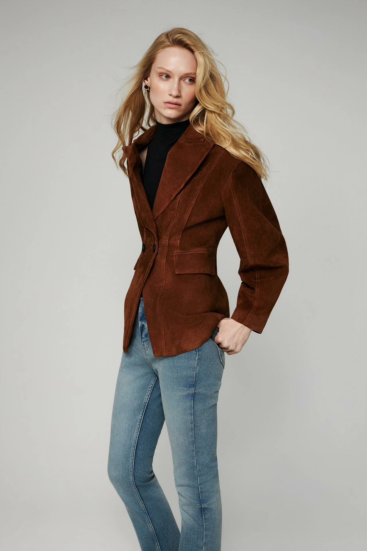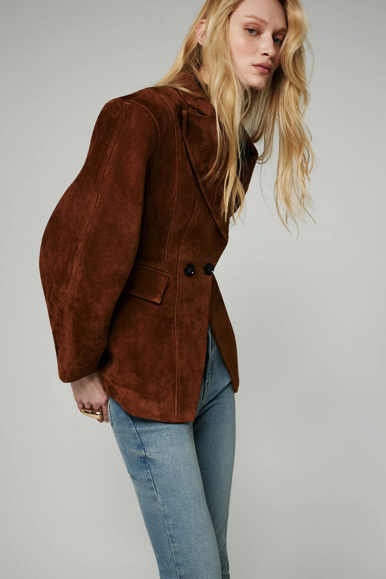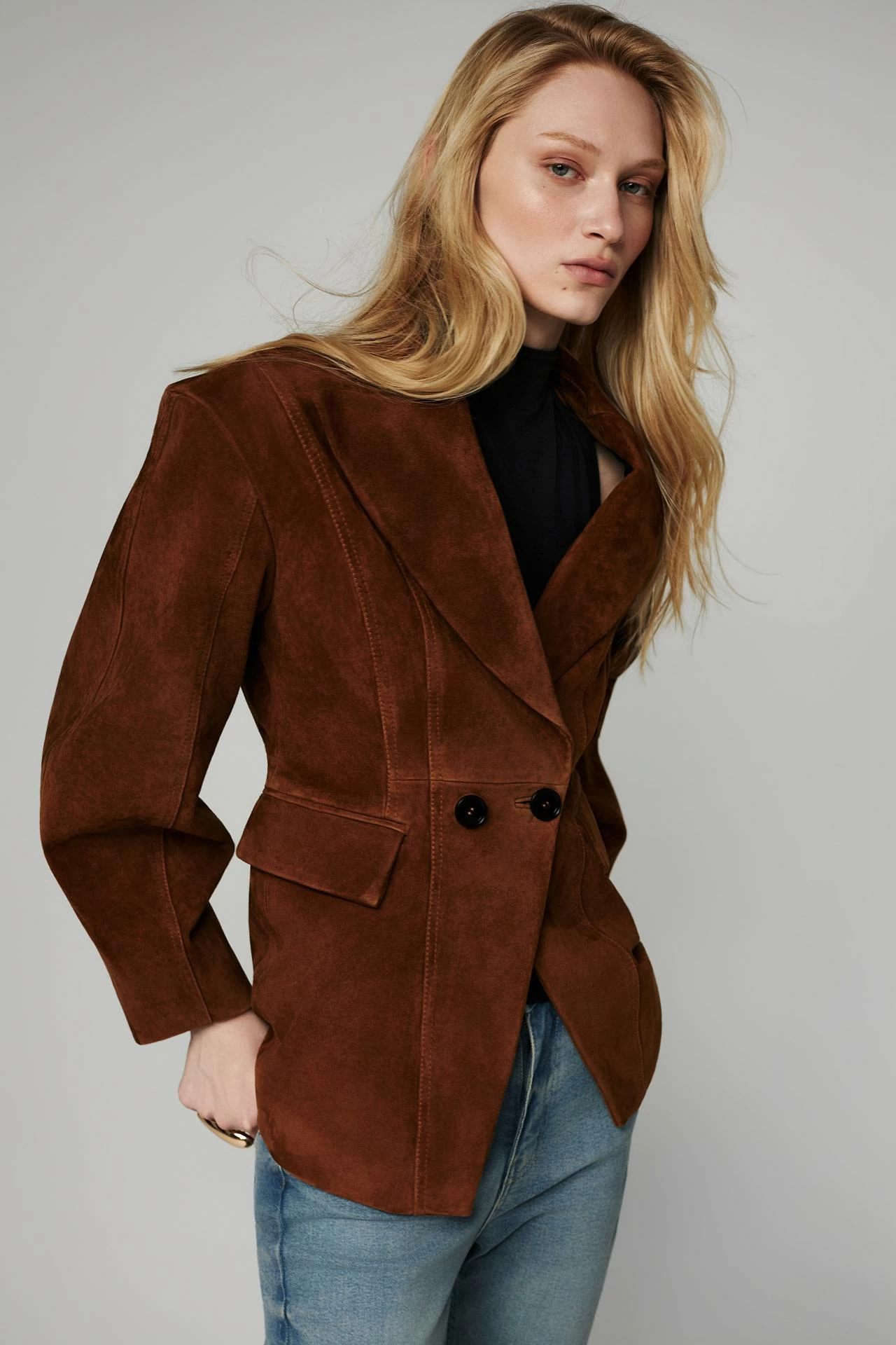 Жакет из натуральной замши в песочном цвете. Приталенный силуэт с акцентными плечами подчёркивает фигуру, классический воротник и двубортная застёжка добавляют элегантности. Рельефные швы по спинке обеспечивают идеальную посадку. Универсальная модель для разных образов. Длина изделия: 70 см.