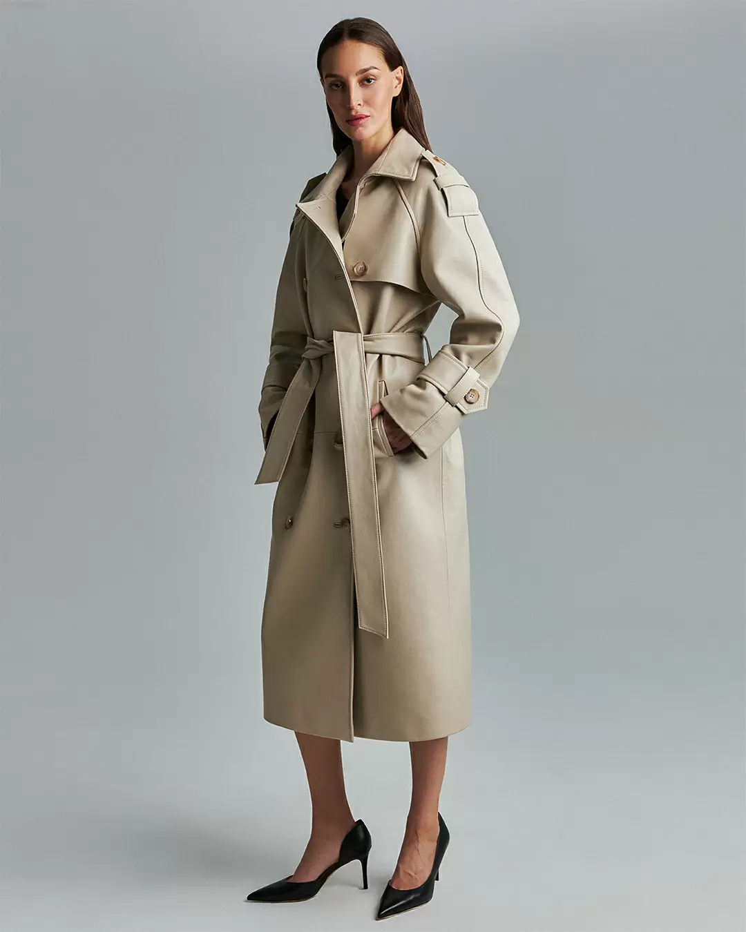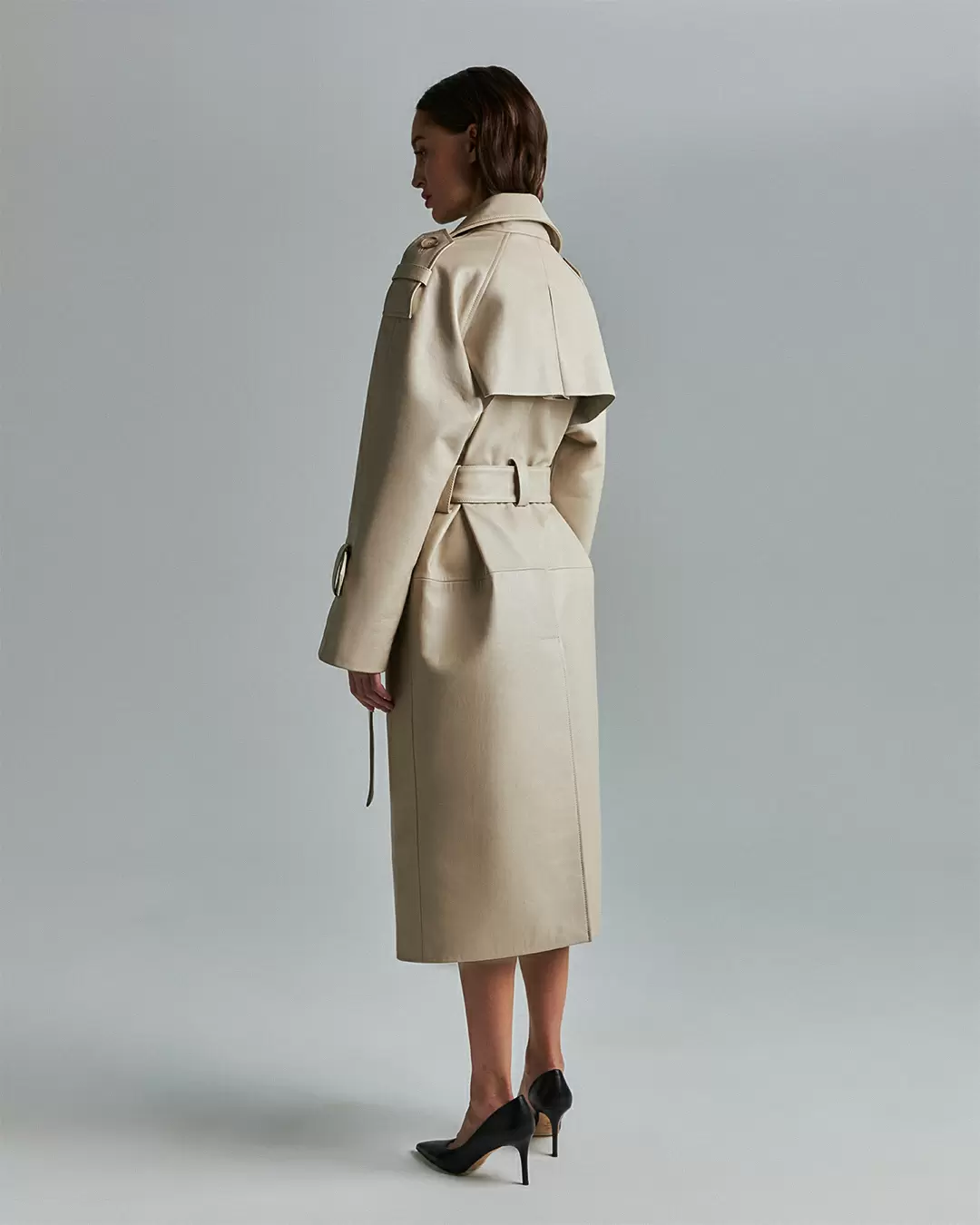Объемный двубортный тренч из плотной итальянской кожи наппа, на пуговицах. Погоны на плечах. Прорезные карманы. Пояс без пряжки. Длина изделия 120 см. Посадка Оверсайз/свободная.