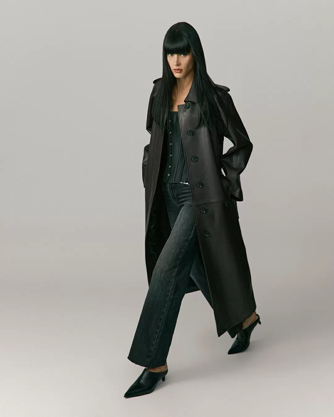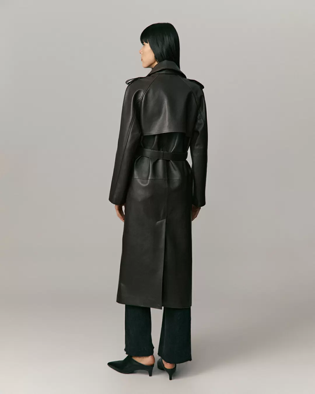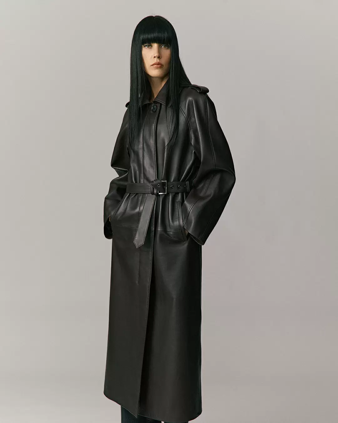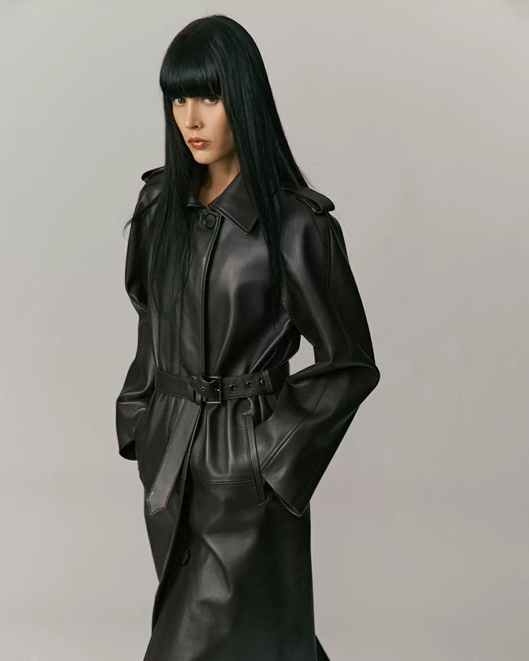 Женское пальто из плотной гладкой кожи наппа, на скрытых пуговицах. Заострённые погоны на плечах. Цельнокройный рукав. Прорезные карманы. Пояс с регулируемой металлической пряжкой. Длина изделия: 120 см. Посадка: свободная/оверсайз.