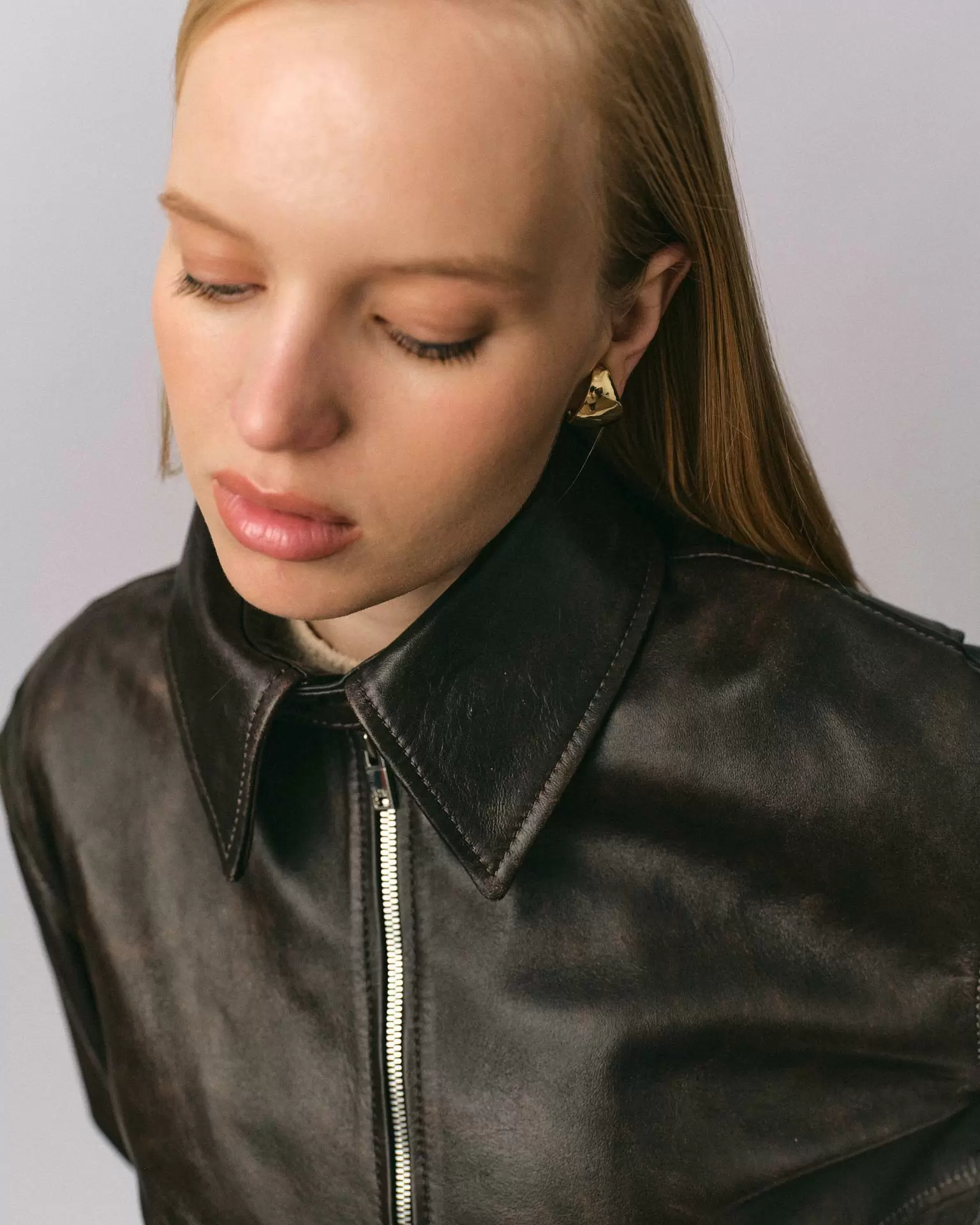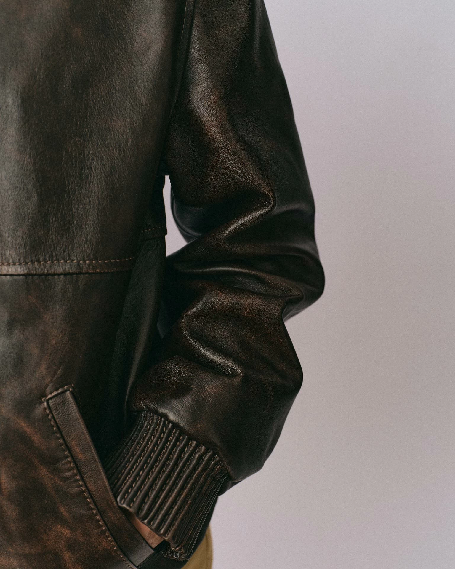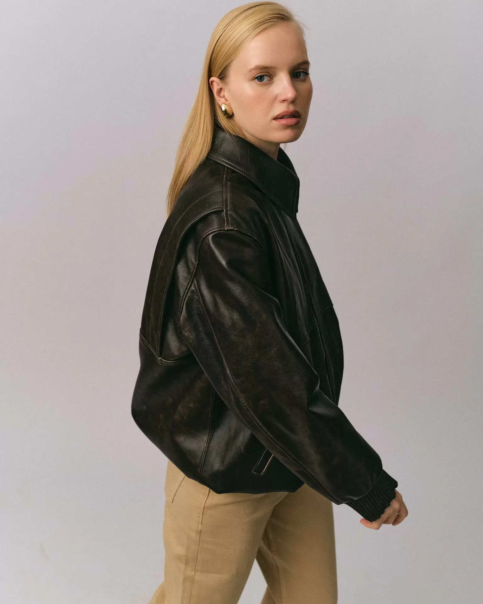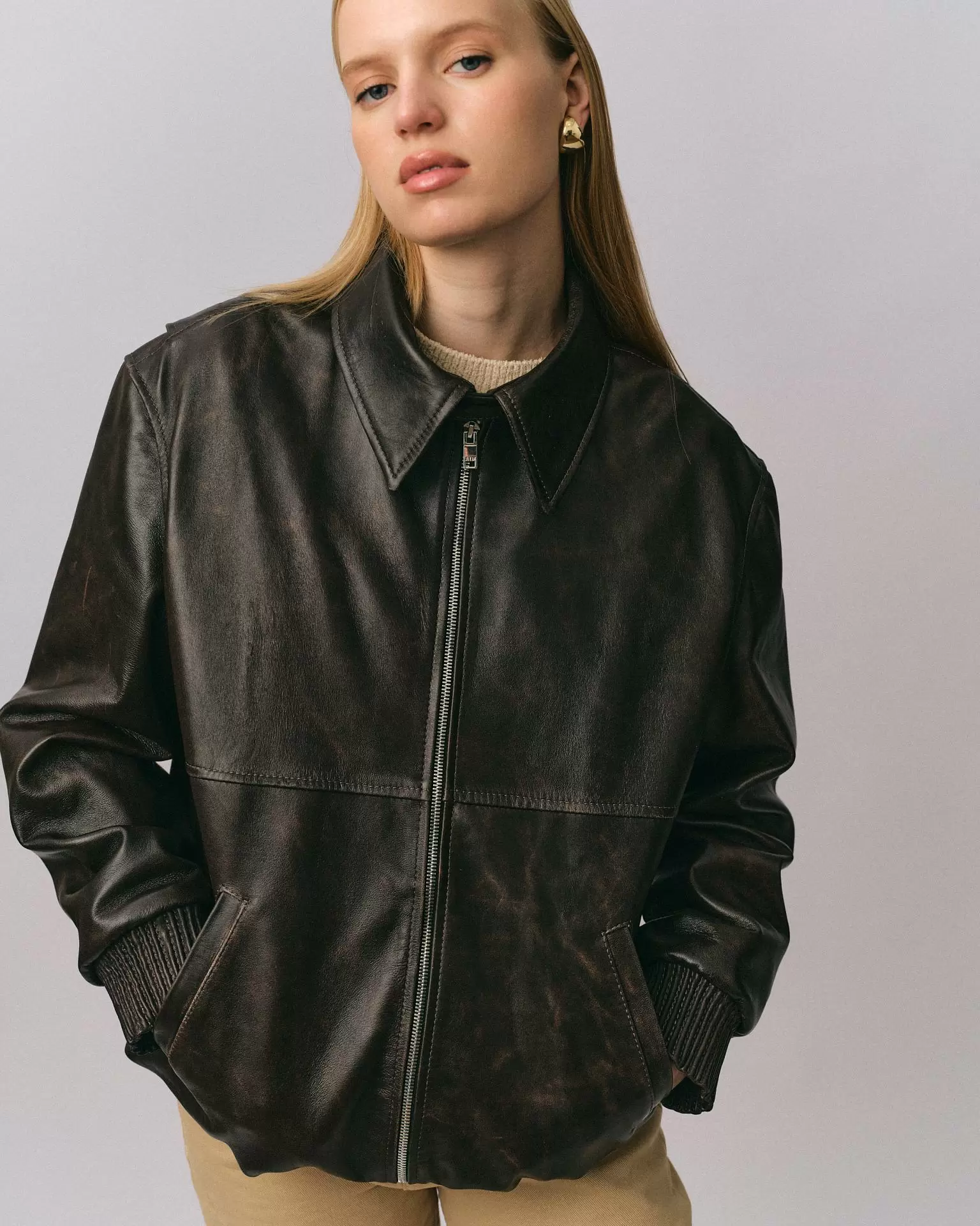 Куртка бомбер рубашечного силуэта из новой коллекции Boho. Выполнена из гладкой кожи наппа винтажной выделки. Свободная посадка oversize. Приспущенная линия плеча, объемные рукава на манжетах. Эластичный плотный пояс. Дополнительный комфорт и свободу движениям придает особый крой спинки со вставками по линии плеч. Длина изделия: 76 см.