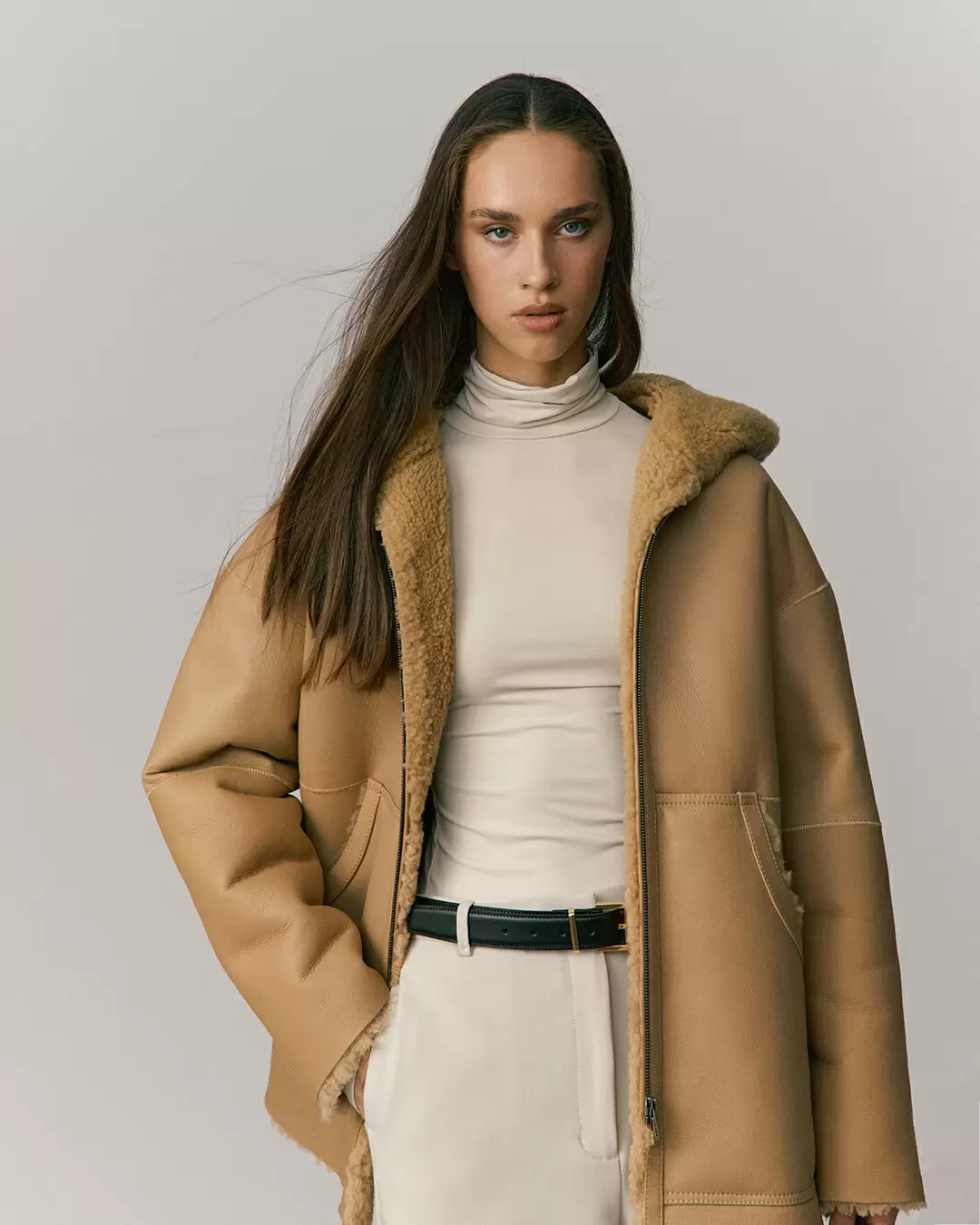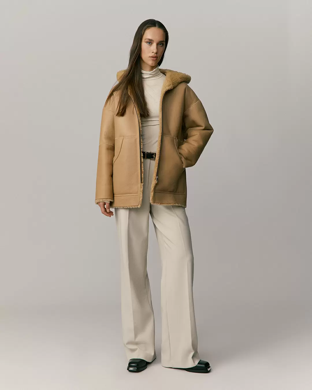 Односторонняя дубленка худи с капюшоном из натуральной овчины Меринос. Коллекция HOODIE. Два накладных передних кармана с полукруглыми вырезами, центральная застежка на молнию, отделка капюшона и молнии планкой. Длина изделия: 76 см. Посадка: Оверсайз/свободная.