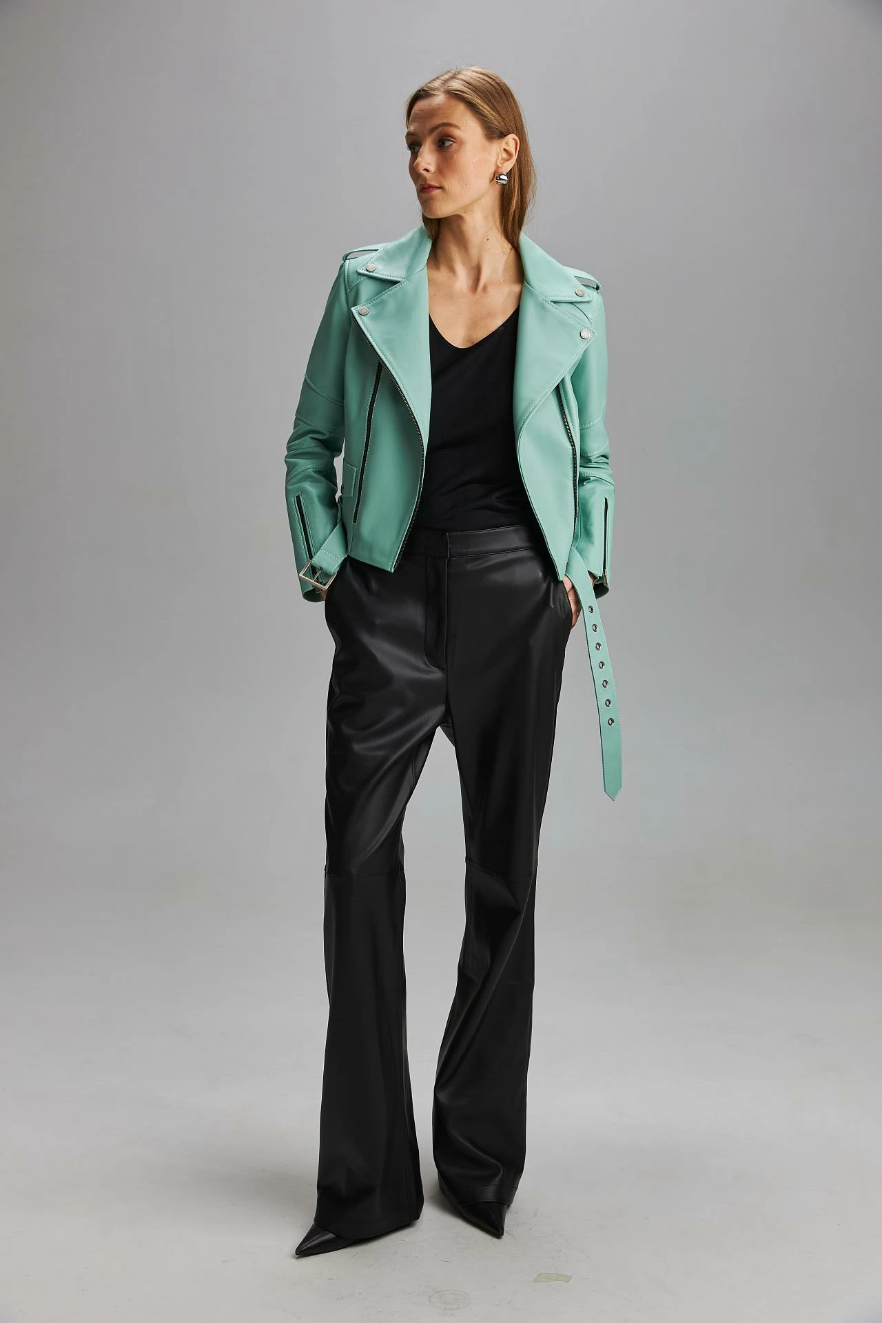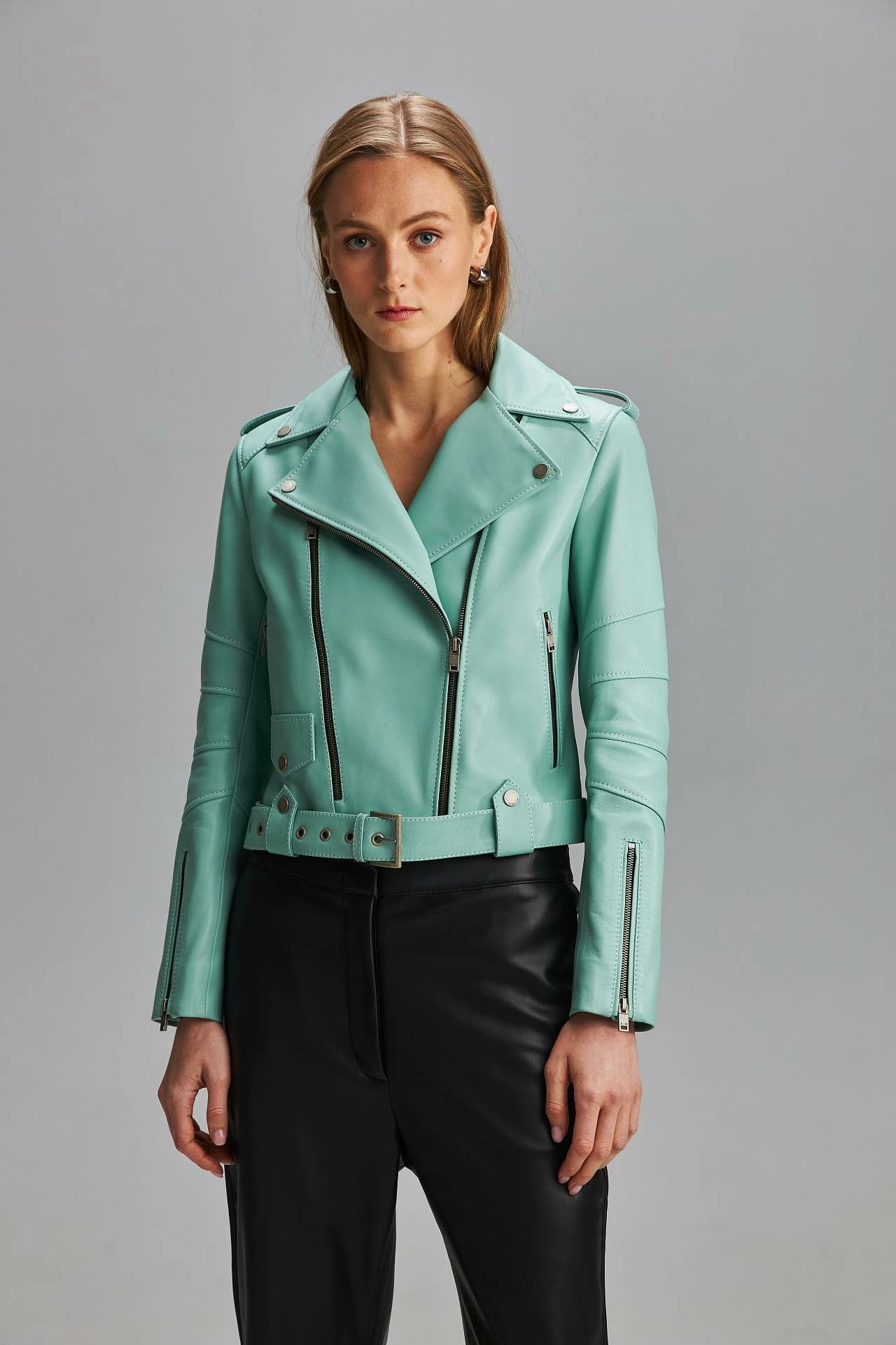 Классическая женская байкерская куртка из гладкой итальянской кожи наппа. Асимметричная застежка-молния. Пояс с пряжкой. Манжеты рукавов с застежками-молниями. Длина изделия: 54 см. Посадка: классическая.