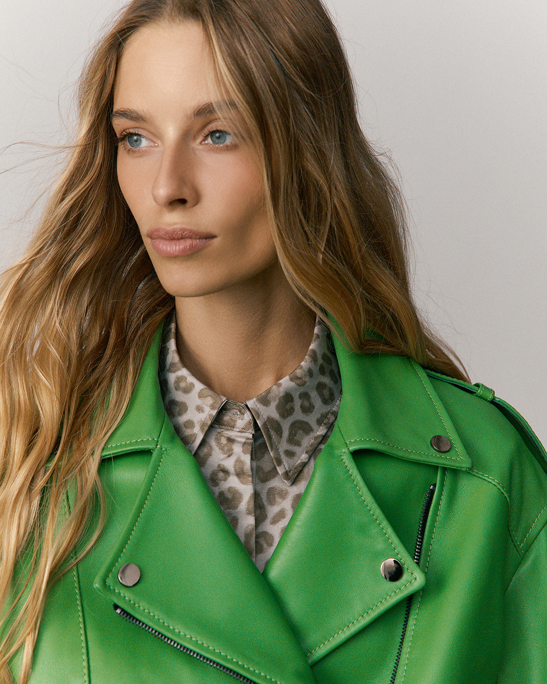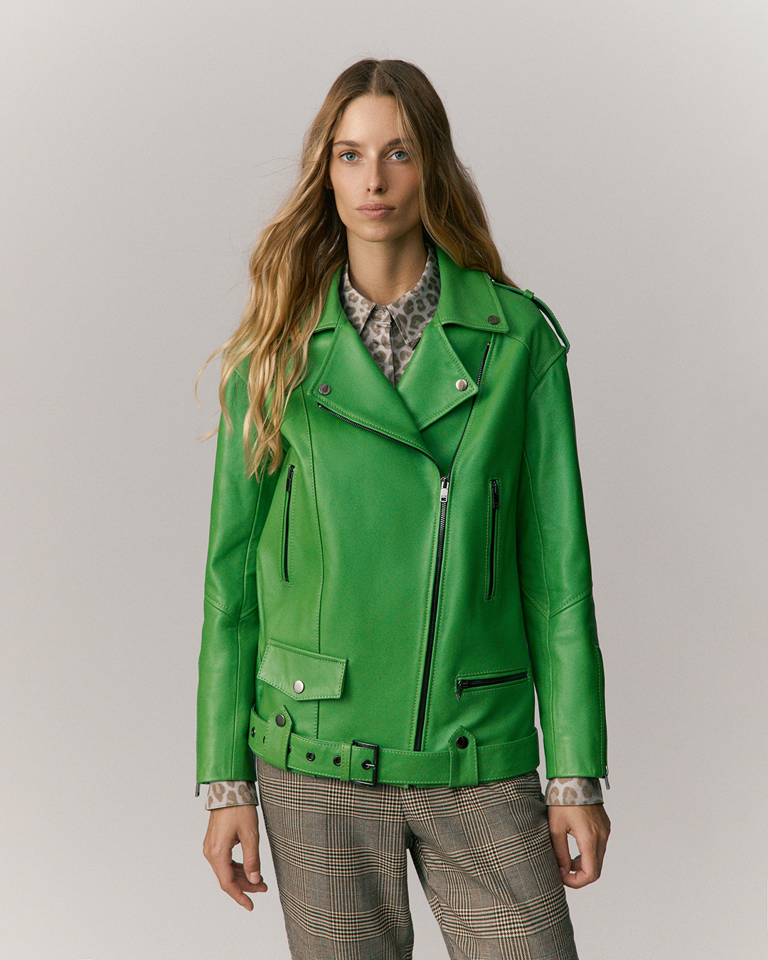 Женская байкерская куртка из гладкой итальянской кожи наппа. Асимметричная застежка-молния. Пояс с пряжкой. Длина изделия: 68 см. Посадка: Оверсайз/ свободная.
